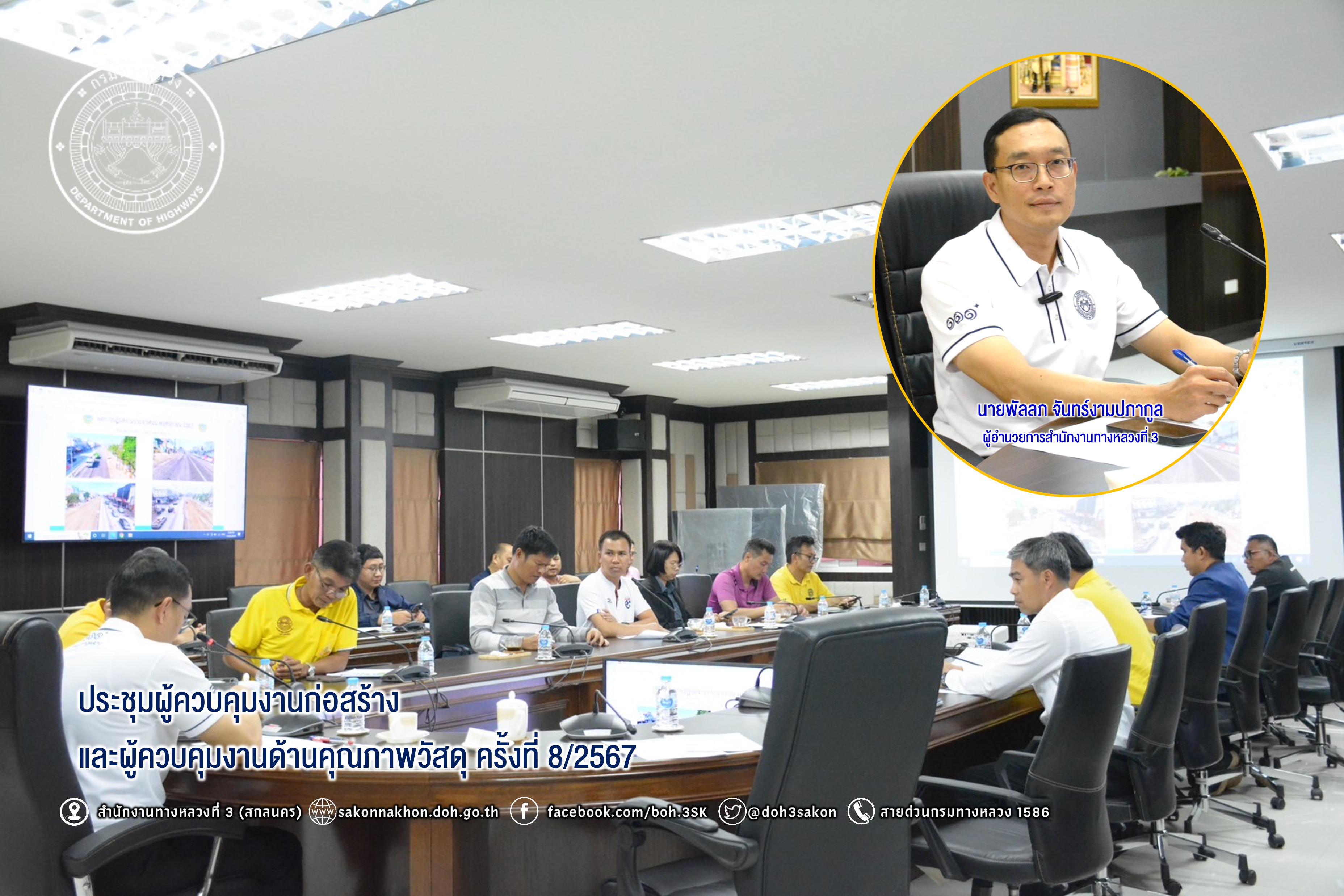วันที่ 26 พฤศจิกายน 2567 เวลา 13.30 -16.30 น. นายพัลลภ จันทร์งามปภากูล ผู้อำนวยการสำนักงานทางหลวงที่ 3 เป็นประธานประชุมผู้ควบคุมงานก่อสร้าง และผู้ควบคุมงานด้านคุณภาพวัสดุ ครั้งที่ 8/2567 โดยมี นายประวัติ เสวตวงษ์ รองผู้อำนวยการสำนักงานทางหลวงที่3 ตำแหน่งที่2 พร้อมด้วยนายชินนพัทธ์ มุลทาทอง ผู้อำนวยการส่วนแผนงาน นายพงษ์ศักดิ์ อาจลา ผู้อำนวยการส่วนควบคุมงานก่อสร้างทาง และวิศวกรโยธา/นายช่างโยธา ส่วนแผนงาน ส่วนสำรวจและออกแบบ ส่วนตรวจสอบและวิเคราะห์ทางวิศวกรรม เจ้าหน้าที่ที่เกี่ยวข้องแขวงทางหลวงในสังกัด เข้าร่วมประชุมผู้ควบคุมงานก่อสร้าง และผู้ควบคุมงานด้านคุณภาพวัสดุ ครั้งที่ 8/2567 เพื่อติดตามผลการดำเนินงานและแก้ไขปัญหาที่เกิดขึ้นจากการก่อสร้าง ในความรับผิดชอบของสำนักงานทางหลวงที่ 3 (สกลนคร) ณ ห้องประชุมทวีพัฒน์ ตินะมาส ชั้น 3 (อาคารหลังใหม่)