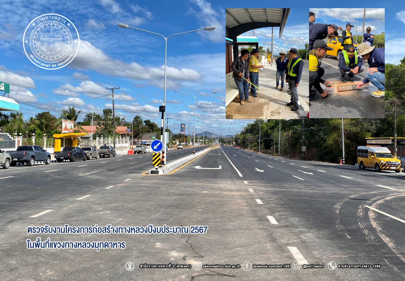 วันที่ 12 ธันวาคม 2567 นายพัลลภ จันทร์งามปภากูล ผู้อำนวยการสำนักงานทางหลวงที่ 3 ประธานกรรมการตรวจรับพัสดุ พร้อมด้วยนายเกรียงศักดิ์ ตันปิยะกุล ผู้อำนวยการแขวงทางหลวงมุกดาหาร กรรมการตรวจรับพัสดุ นายทศพล โพธิ์พรหมเมศ นายช่างโยธาชำนาญงาน นายช่างผู้ควบคุมงานก่อสร้าง และคณะกรรมการตรวจรับพัสดุ ลงพื้นตรวจรับงานโครงการก่อสร้างทางหลวงปีงบประมาณ 2567 ในพื้นที่แขวงทางหลวงมุกดาหาร จำนวน 2 โครงการ