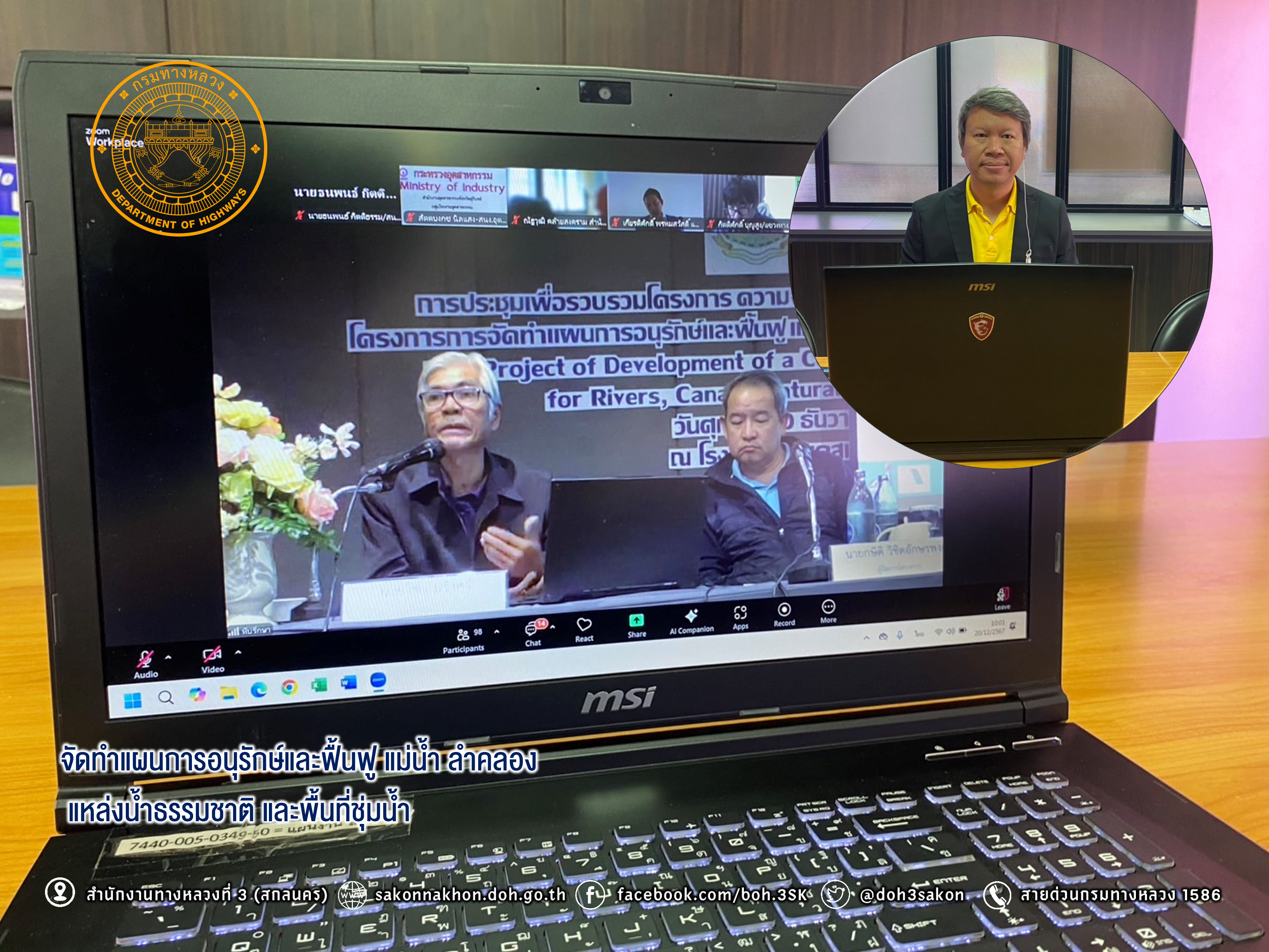 วันที่ 20 ธันวาคม 2567 เวลา 08.30 - 13.00 น. นายธนพนธ์ กิตติธรรม นายช่างโยธาชำนาญงานส่วนแผนงาน ได้รับมอบหมายจาก ผู้อำนวยการสำนักงานทางหลวงที่ 3 ให้เข้าร่วมการประชุมกลุ่มย่อย เพื่อรวบรวมโครงการ ความจำเป็น และข้อเสนอโครงการจากหน่วยงานโครงการค่าใช้จ่ายในการจัดทำแผนการอนุรักษ์และฟื้นฟู แม่น้ำ ลำคลอง แหล่งน้ำธรรมชาติ และพื้นที่ชุ่มน้ำ โดยโครงการดังกล่าวได้กำหนดให้มีการจัดการประชุมกลุ่มย่อยเพื่อรวบรวมโครงการ และข้อเสนอโครงการจากหน่วยงานหลักในพื้นที่ โดยการมีส่วนร่วมขององค์กรปกครองส่วนท้องถิ่น ประชาชน และผู้มีส่วนที่เกี่ยวข้องในพื้นที่ชุ่มน้ำ ในภาคกลางและภาคตะวันตก ภาคตะวันออก ภาคเหนือ ภาคตะวันออกเฉียงเหนือ และภาคใต้ รวมจำนวน 5 ครั้ง ภาคละ 1 ครั้ง ผ่านระบบออนไลน์ Zoom Cloud Meeting ณ สำนักงานทางหลวงที่ 3 (สกลนคร) จัดโดย กองอนุรักษ์ทรัพยากรน้ำ กรมทรัพยากรน้ำ