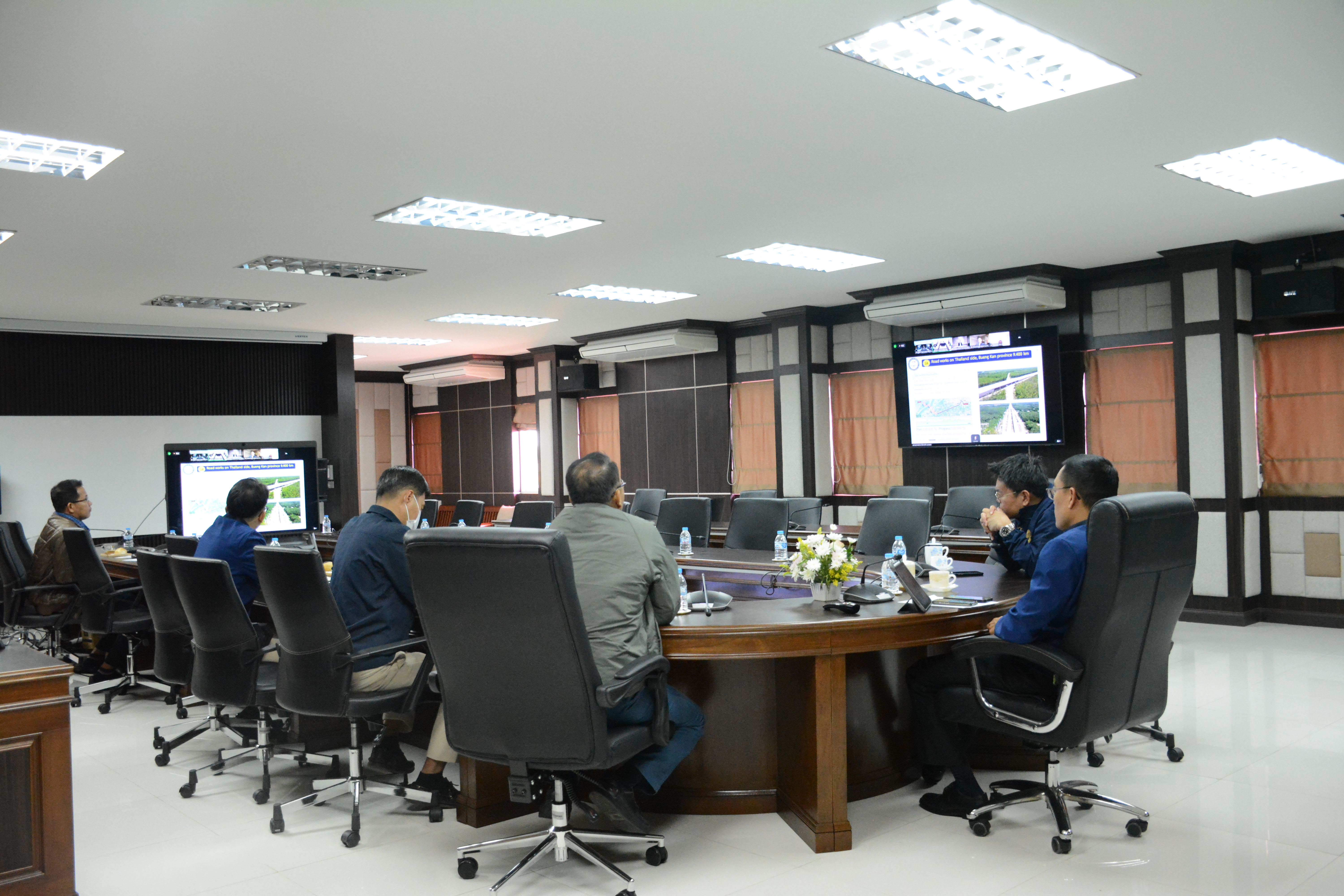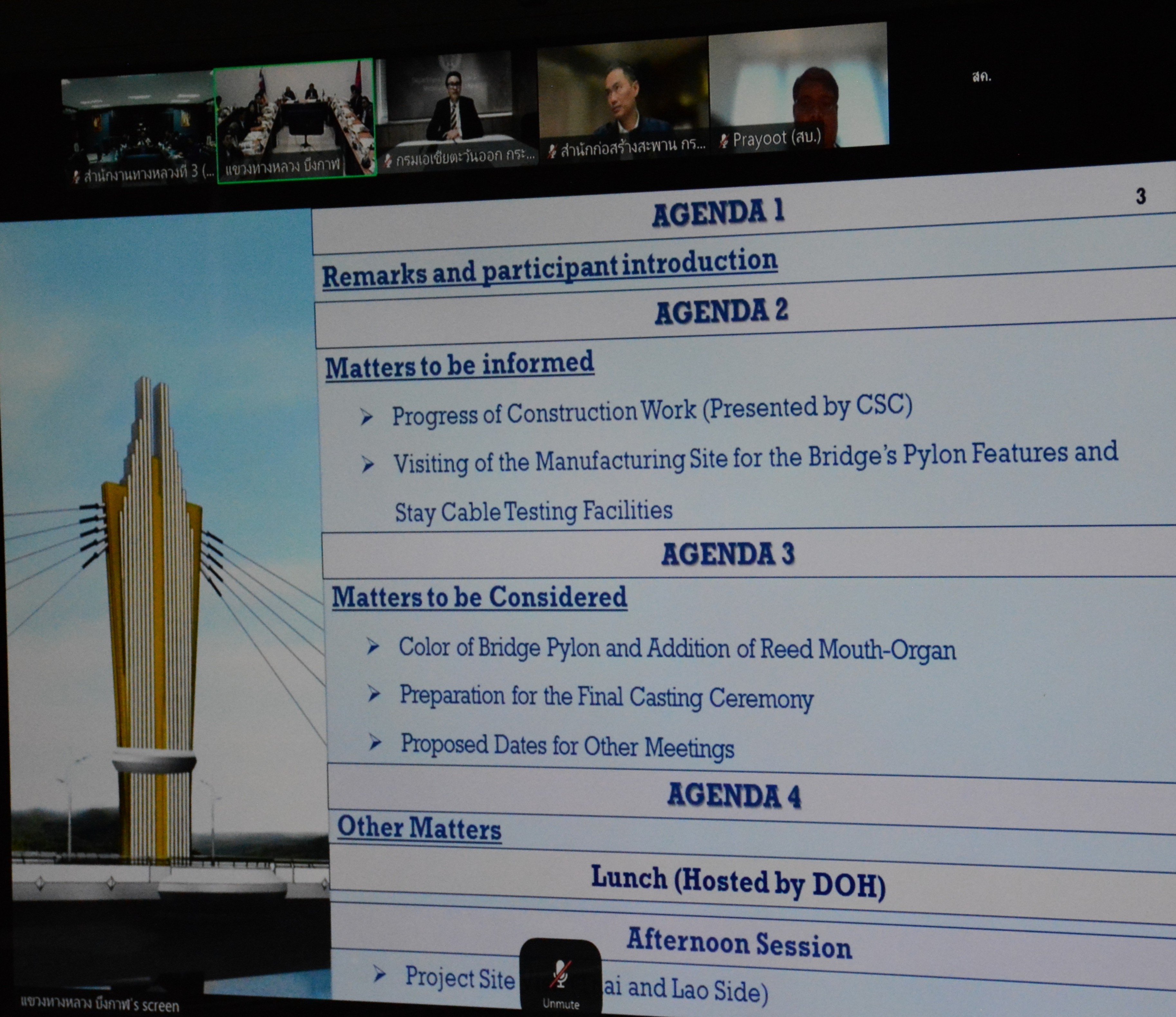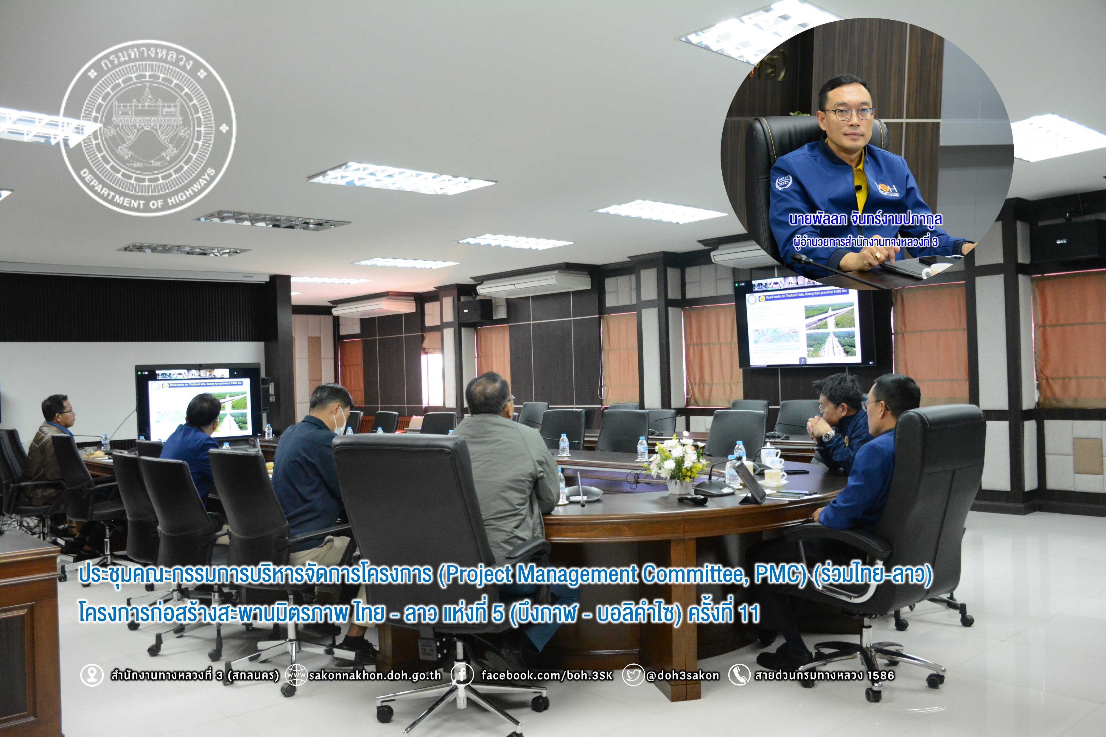วันที่ 13 มกราคม 2568 เวลา 10.00 - 12.00 น.นายพัลลภ จันทร์งามปภากูล ผู้อำนวยการสำนักงานทางหลวงที่ 3 พร้อมด้วย นายเดชา พรวนพิทักษ์ รส.ทล.3.1, นายประวัติ เสวตวงษ์ รส.ทล.3.2, นายชินนพัทธ์ มุลทาทอง วผ.ทล.3 และวิศวกรโยธา ส่วนแผนงาน เข้าร่วมประชุมคณะกรรมการบริหารจัดการโครงการ (Project Management Committee, PMC) (ร่วมไทย-ลาว) โครงการก่อสร้างสะพานมิตรภาพ ไทย - ลาว แห่งที่ 5 (บึงกาฬ - บอลิคำไซ) ครั้งที่ 11 เพื่อพิจารณาในเรื่องความก้าวหน้างานก่อสร้าง และการเตรียมความพร้อมสำหรับพิธีเทคอนกรีตของสะพานมิตรภาพไทย - ลาว แห่งที่ 5 (บึงกาฬ - บอลิคำไซ) ผ่านสื่ออิเล็กทรอนิกส์ Zoom Video Conference ณ ห้องประชุมทวีพัฒน์ ตินะมาส ชั้น 3 อาคารหลังใหม่ โดยมี นายธานินทร์ ริรัตนพงษ์ วิศวกรใหญ่ด้านวางแผนและวางโครงการก่อสร้าง เป็นประธานร่วมฝ่ายไทยฯ