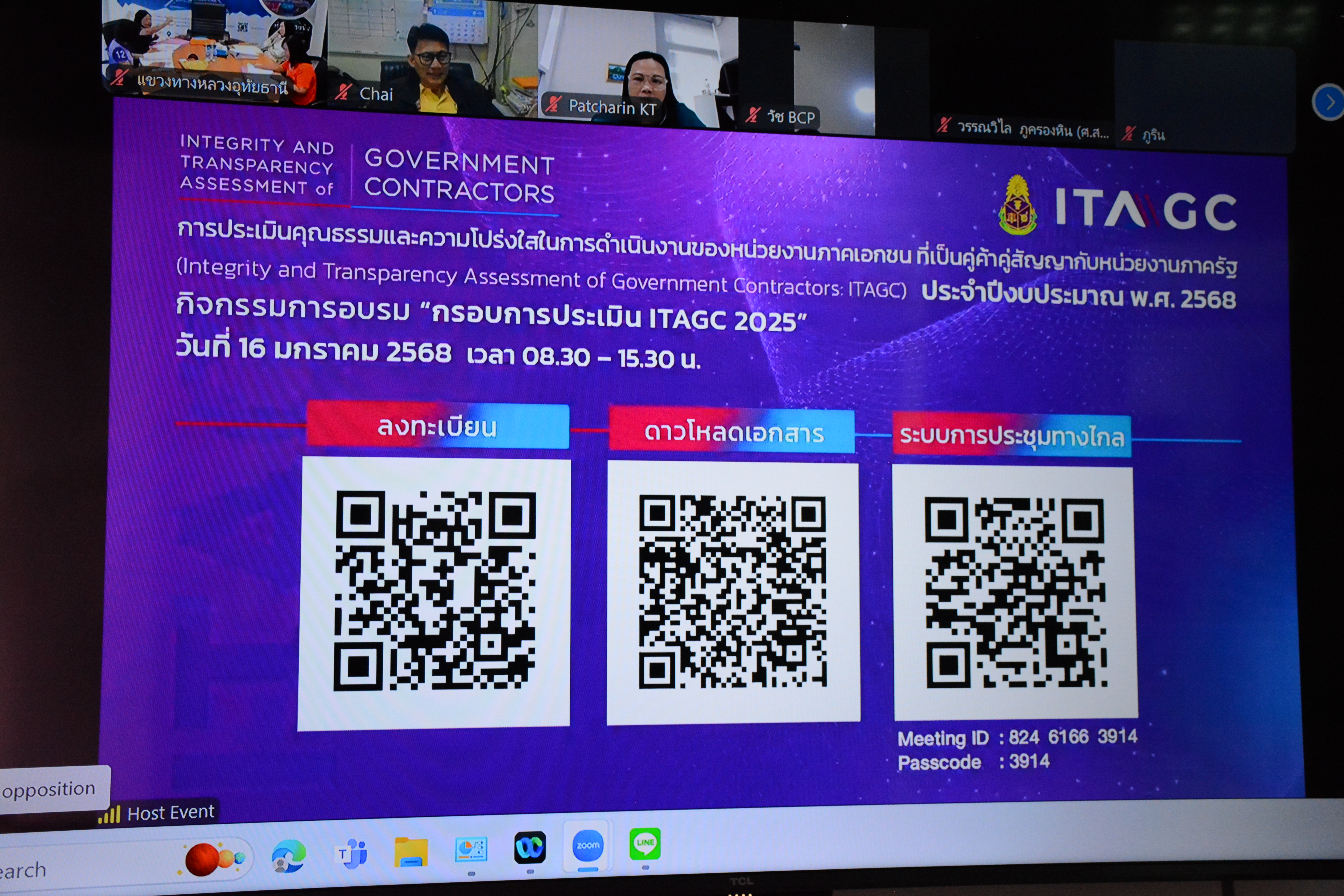 วันที่ 16 มกราคม 2568 เวลา 08.30 - 15.30 น.นางนภาพิศ สุวรรณศรี ผู้อำนวยการฝ่ายบริหารงานทั่วไป พร้อมด้วย เจ้าหน้าที่งานสารบรรณ เข้าร่วมกิจกรรมการอบรม “กรอบการประเมิน ITAGC 2025” ตามโครงการประเมินคุณธรรมและความโปร่งใสในการดำเนินงานของหน่วยงานภาคเอกชน ที่เป็นคู่ค้าคู่สัญญากับหน่วยงานภาครัฐ (Integrity and Transparency Assessment of Government Contractors : ITAGC) ประจำปีงบประมาณ พ.ศ.2568 ผ่านระบบ Zoom Cloud Meeting ณ ห้องประชุมชั้น 2 อาคารหลังใหม่ สำนักงานทางหลวงที่ 3 (สกลนคร) จัดโดย สำนักงาน ป.ป.ช.