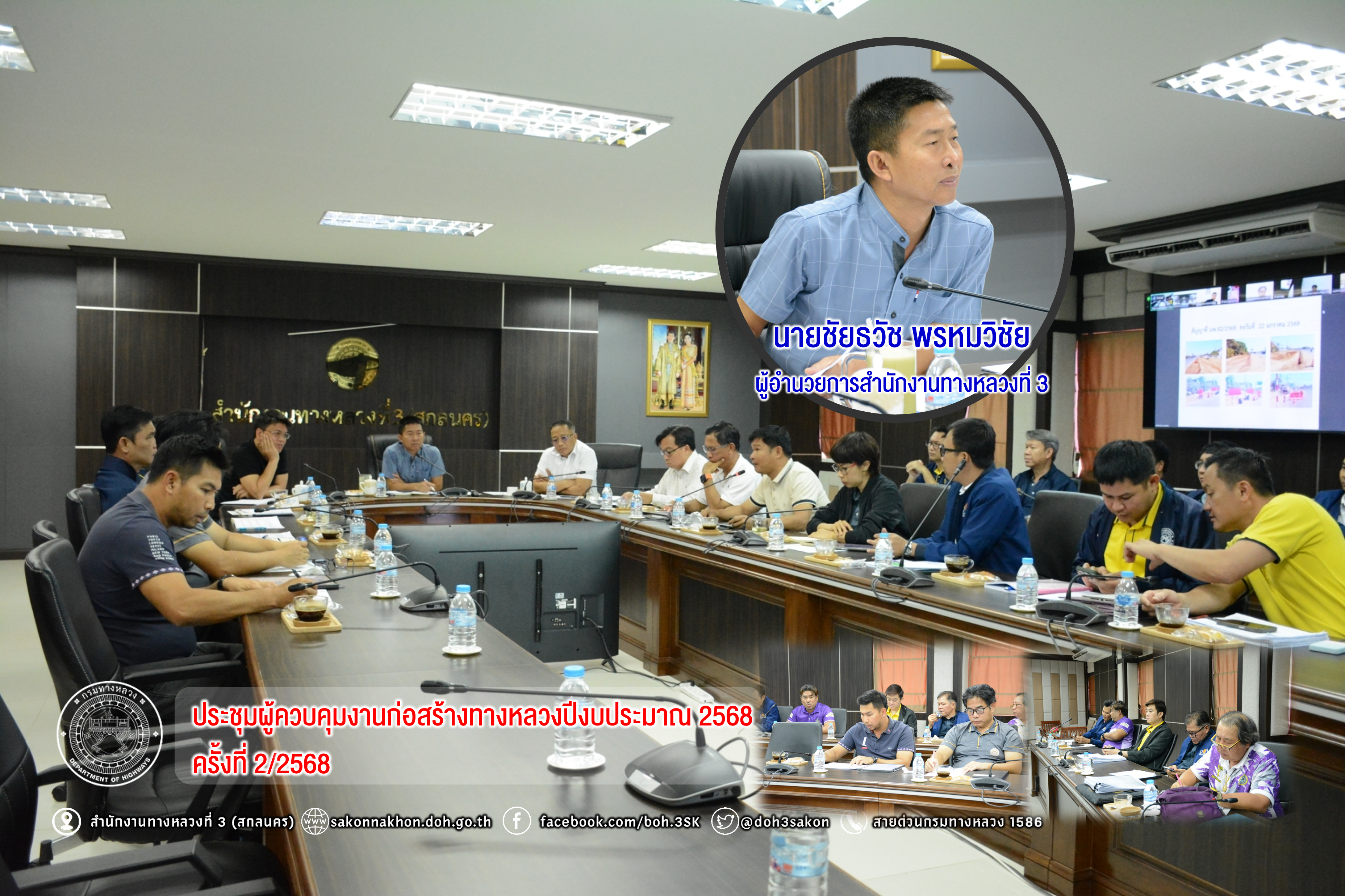วันที่ 25 กุมภาพันธ์ 2568 เวลา 10.00 น.นายชัยธวัช พรหมวิชัย ผู้อำนวยการสำนักงานทางหลวงที่ 3 เป็นประธาน ประชุมผู้ควบคุมงานก่อสร้างทางหลวงปีงบประมาณ 2568 ครั้งที่ 2/2568 โดยมี นายเดชา พรวนพิทักษ์ รองผู้อำนวยการสำนักงานทางหลวงที่ 3 ตำแหน่งที่ 1นายประวัติ เสวตวงษ์ รองผู้อำนวยการสำนักงานทางหลวงที่ 3 ตำแหน่งที่ 2 นายสนธยา พลเยี่ยม รองผู้อำนวยการแขวงทางหลวงสกลนครที่ 1 นายชินนพัทธ์ มุลทาทอง ผู้อำนวยการส่วนแผนงาน นายพงษ์ศักดิ์ อาจลา ผู้อำนวยการส่วนควบคุมงานก่อสร้าง นายเอกชัย แสนสงค์ ผู้อำนวยการส่วนตรวจสอบและวิเคราะห์ทางวิศวกรรม และวิศวกรโยธา/นายช่างโยธา ส่วนแผนงาน ส่วนควบคุมงานก่อสร้างทาง ส่วนตรวจสอบและวิเคราะห์ทางวิศวกรรม ส่วนอำนวยความปลอดภัย และผู้ช่วยผู้ควบคุมงาน เข้าร่วมประชุมเพื่อเตรียมความพร้อมในการควบคุมงานก่อสร้างทางปีงบประมาณ 2568 ที่เป็นความรับผิดชอบของสำนักงานทางหลวงที่ 3 (สกลนคร) ณ ห้องประชุมทวีพัฒน์ ตินะมาส ชั้น 3 (อาคารหลังใหม่) โดยมี แขวงทางหลวงในสังกัด เข้าร่วมประชุมออนไลน์ผ่านทางระบบ ZOOM