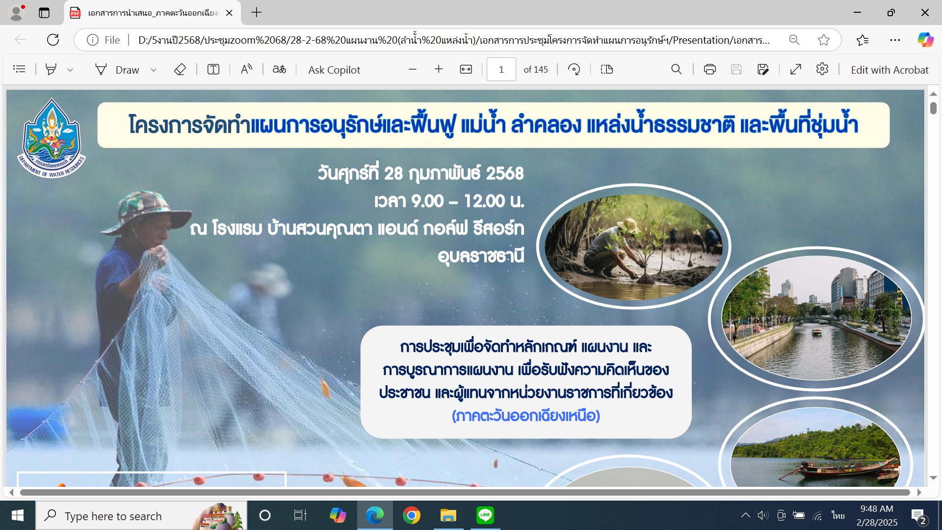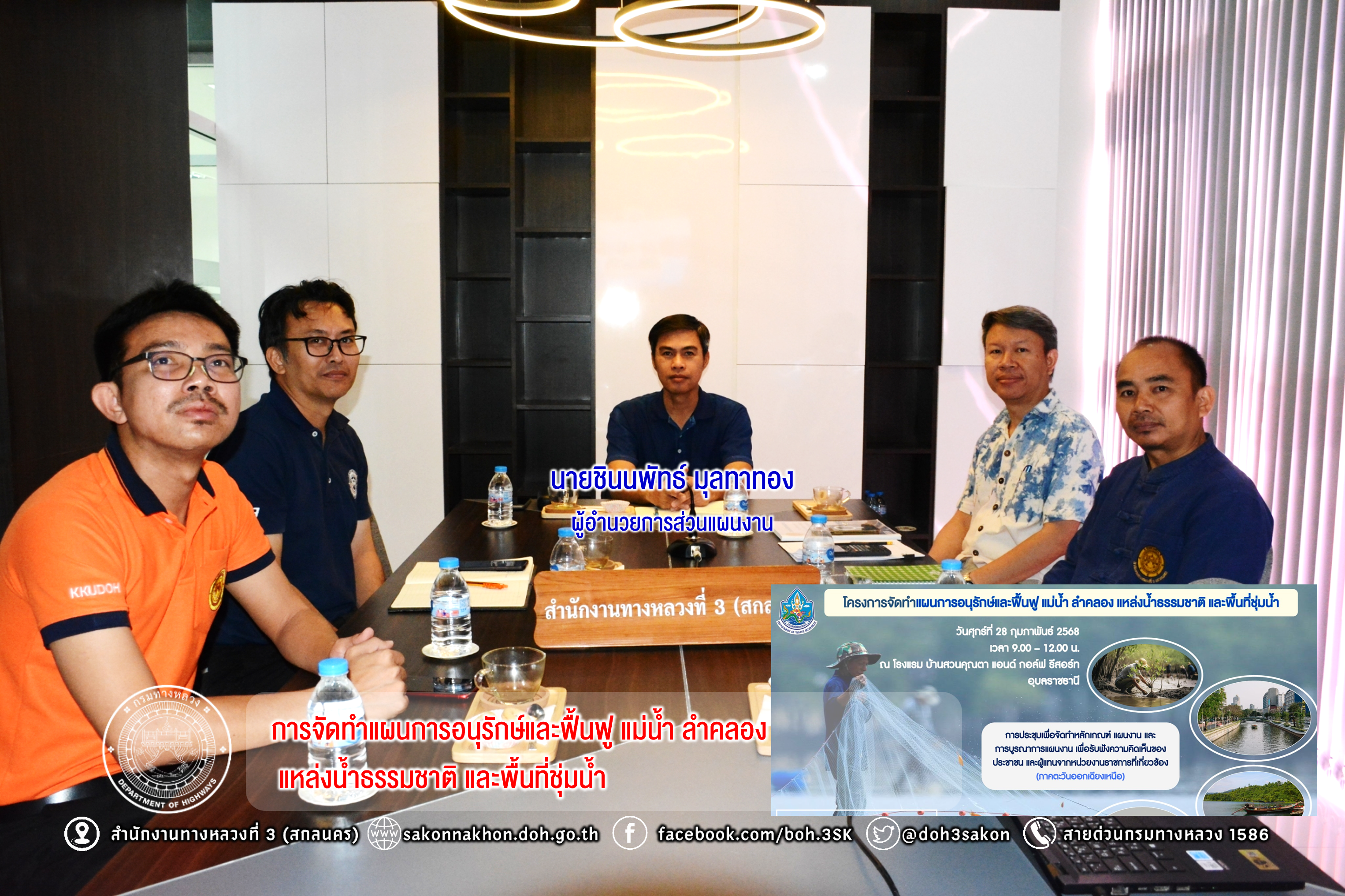 วันที่ 28 กุมภาพันธ์ 2568 เวลา 08.30 - 12.00 น.นายชินนพัทธ์ มุลทาทอง ผู้อำนวยการส่วนแผนงาน พร้อมด้วย วิศวกรโยธา/นายช่างโยธา ส่วนแผนงาน ได้รับมอบหมายจากผู้อำนวยการสำนักงานทางหลวงที่ 3 ให้เข้าร่วมประชุมเพื่อจัดทำหลักเกณฑ์ แผนงาน และการบูรณาการแผนงาน เพื่อรับฟังความคิดเห็นของประชาชน และผู้แทนจากหน่วยงานราชการที่เกี่ยวข้อง โครงการค่าใช้จ่ายในการจัดทำแผนการอนุรักษ์และฟื้นฟู แม่น้ำ ลำคลอง แหล่งน้ำธรรมชาติ และพื้นที่ชุ่มน้ำ ผ่านระบบการประชุมออนไลน์ Zoom Meeting ณ ห้องประชุมชั้น 2 อาคารหลังใหม่ สำนักงานทางหลวงที่ 3 (สกลนคร)