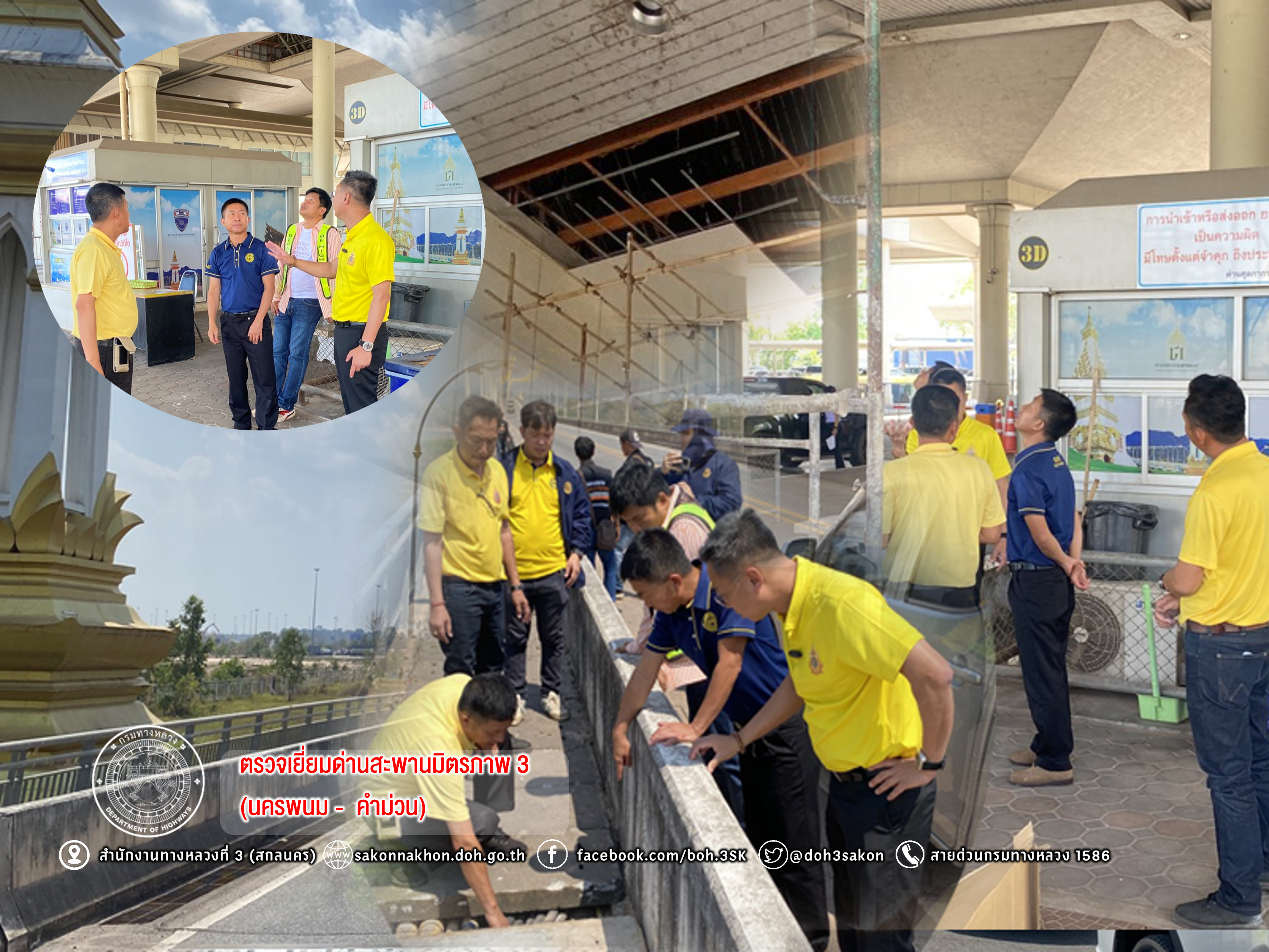 วันที่ 12 มีนาคม 2568 เวลา 14.00 น.นายชัยธวัช พรหมวิชัย ผู้อำนวยการสำนักงานทางหลวงที่ 3 พร้อมด้วยพิชญ รุ่งเรืองวิโรจน์ ผู้อำนวยการแขวงทางหลวงนครพนม และคณะลงพื้นที่ตรวจเยี่ยมด่านสะพานมิตรภาพ 3 (นครพนม - คำม่วน) พร้อมตรวจจุดที่ขออนุญาตติดตั้งสายเคเบิลใยแก้วนำแสงใต้ทางเท้าบนสะพานมิตรภาพ 3 (นครพนม - คำม่วน) เพื่อส่งเสริมความปลอดภัยและประสิทธิภาพของสะพานมิตรภาพ