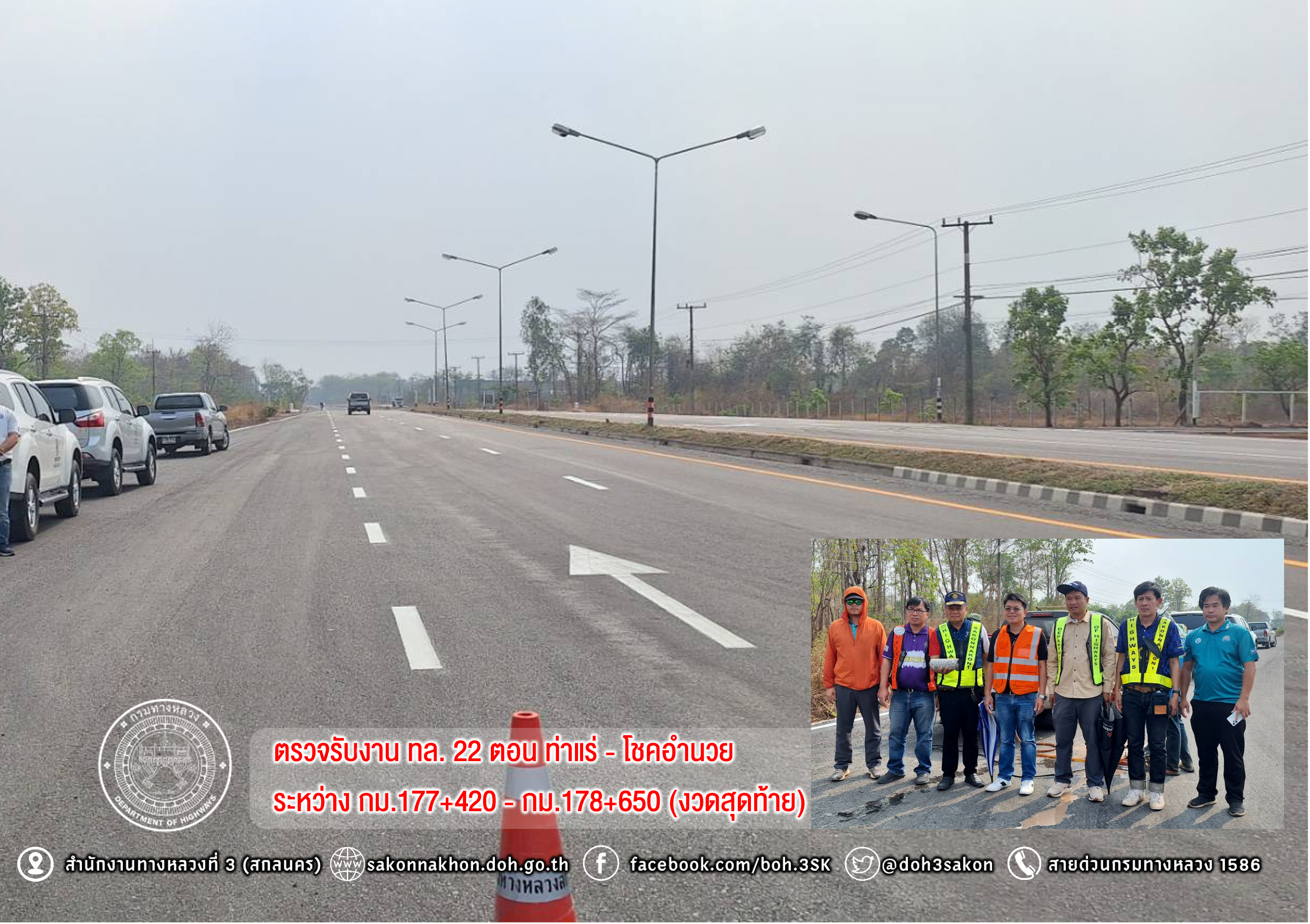 วันที่ 27 มีนาคม 2568 นายเดชา พรวนพิทักษ์ รองผู้อำนวยการสำนักงานทางหลวงที่ 3 ประธานคณะกรรมการตรวจรับพัสดุ พร้อมด้วยนายประสิทธิ์ สาขา ผู้อำนวยการแขวงทางหลวงสกลนครที่ 1 กรรมการตรวจรับพัสดุ และคณะกรรมการตรวจรับพัสดุ ตรวจรับงานงานจ้างเหมากิจกรรมบูรณะโครงข่ายทางหลวงเชื่อมโยงระหว่างภาค ทางหลวงหมายเลข 22 ตอนควบคุม 0402 ตอน ท่าแร่ - โชคอำนวย ระหว่าง กม.177+420 - กม.178+650 ปริมาณงาน 1 แห่ง (1.230 กม.) วงเงิน 29,956,000 บาท โดยมีห้างหุ้นส่วน ศิริสินก่อสร้าง จำกัด เป็นผู้รับจ้างเพื่อให้ได้ตามแบบมาตรฐานของกรมทางหลวง ควบคุมการก่อสร้างโดยนายวิริยะ ปากดีสี วิศวกรโยธาปฏิบัติการ นายช่างผู้ควบคุมงานก่อสร้าง ส่วนควบคุมงานก่อสร้างทาง สำนักงานทางหลวงที่ 3 (สกลนคร) กรมทางหลวง กระทรวงคมนาคม