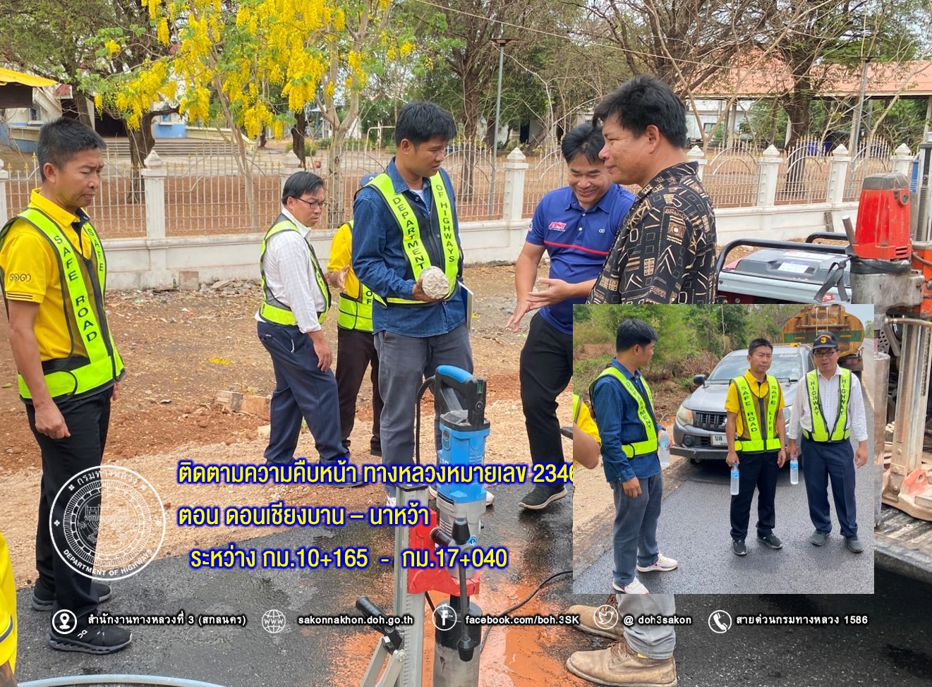 วันที่ 10 เมษายน 2568 นายชัยธวัช พรหมวิชัย ผู้อำนวยการสำนักงานทางหลวงที่ 3 ประธานคณะกรรมการตรวจรับพัสดุ พร้อมด้วยนายประสิทธิ์ สาขา ผู้อำนวยการแขวงทางหลวงสกลนครที่ 1 และคณะกรรมการตรวจรับพัสดุ ลงพื้นที่ติดตามความคืบหน้างานก่อสร้างเพิ่มประสิทธิภาพทาง ทางหลวงหมายเลข 2346 ตอน ดอนเชียงบาน – นาหว้า ระหว่าง กม.10+165 - กม.17+040 ปริมาณ 1 แห่ง (6.875กม.) วงเงิน 79,979,000 บาท (ตรวจรับงานงวดที่ 1) มีบริษัท สกลนวกิจ จำกัด เป็นผู้รับจ้าง (ตรวจรับงานงวดที่ 1) ควบคุมการก่อสร้างโดยนายวิริยะ ปากดีสี วิศวกรโยธาปฏิบัติการ นายช่างผู้ควบคุมงานก่อสร้าง ส่วนควบคุมงานก่อสร้างทาง สำนักงานทางหลวงที่ 3 (สกลนคร)