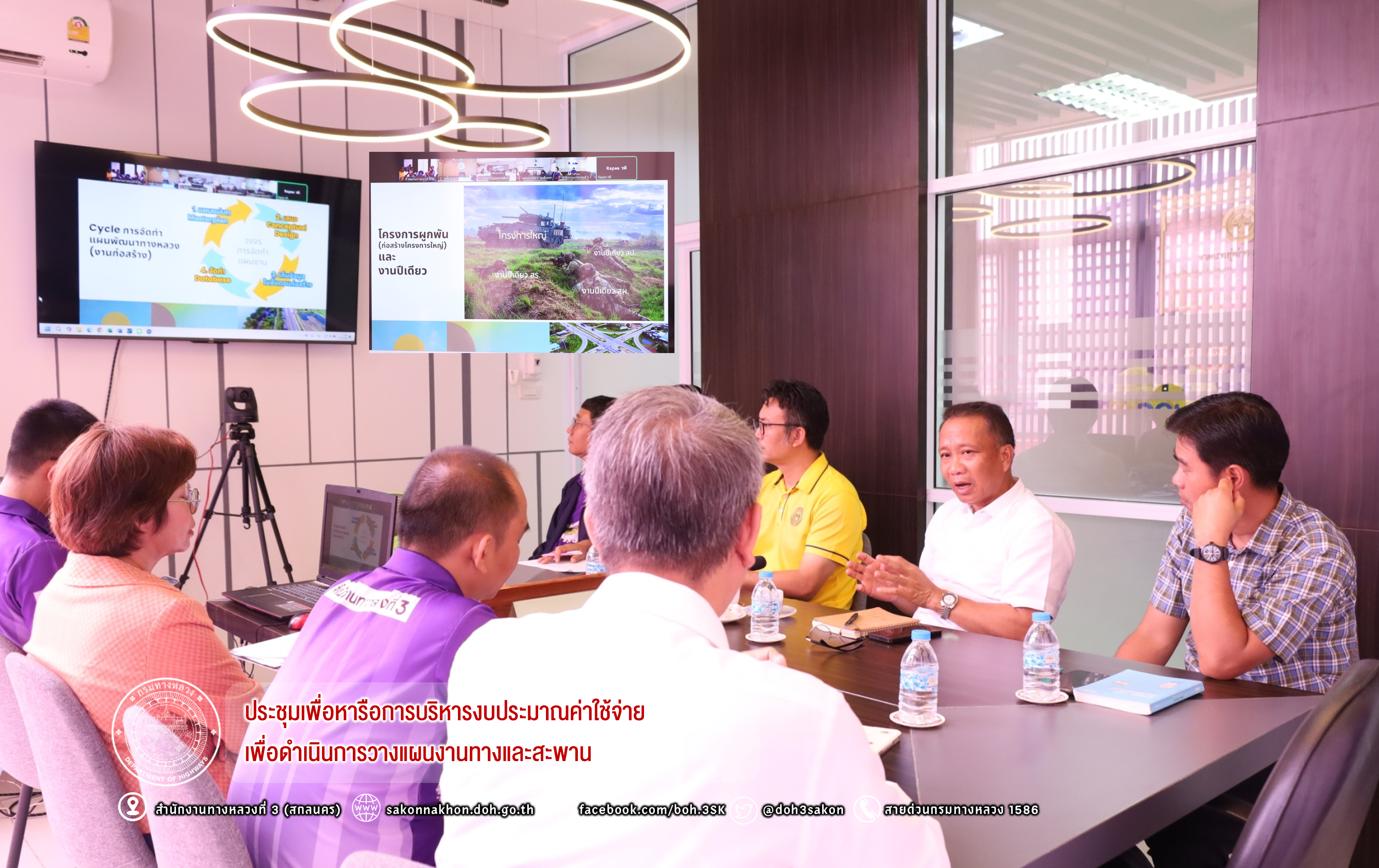 วันที่ 7 พฤษภาคม 2568 เวลา 09.30 นายประวัติ เสวตวงษ์ รองผู้อำนวยการสำนักงานทางหลวงที่ 3 พร้อมด้วย นางนภาพิศ สุวรรณศรี ผู้อำนวยการส่วนบริหาร, นายชินนพัทธ์ มุลทาทอง ผู้อำนวยการส่วนแผนงาน, นางรุ่งดาว ชมภูวิเศษ หัวหน้างานการเงินและบัญชี และวิศวกรโยธา/นายช่างโยธา ส่วนแผนงาน และส่วนสำรวจและออกแบบ ได้รับมอบหมายจากผู้อำนวยการสำนักงานทางหลวงที่ 3 ให้เข้าร่วมประชุมเพื่อหารือการบริหารงบประมาณค่าใช้จ่ายเพื่อดำเนินการวางแผนงานทางและสะพาน ให้เกิดประสิทธิผลและถูกต้องตามระเบียบ ผ่านระบบ Zoom Cloud Meeting ณ ห้องประชุมชั้น 2 อาคารหลังใหม่ สำนักงานทางหลวงที่ 3 (สกลนคร)
