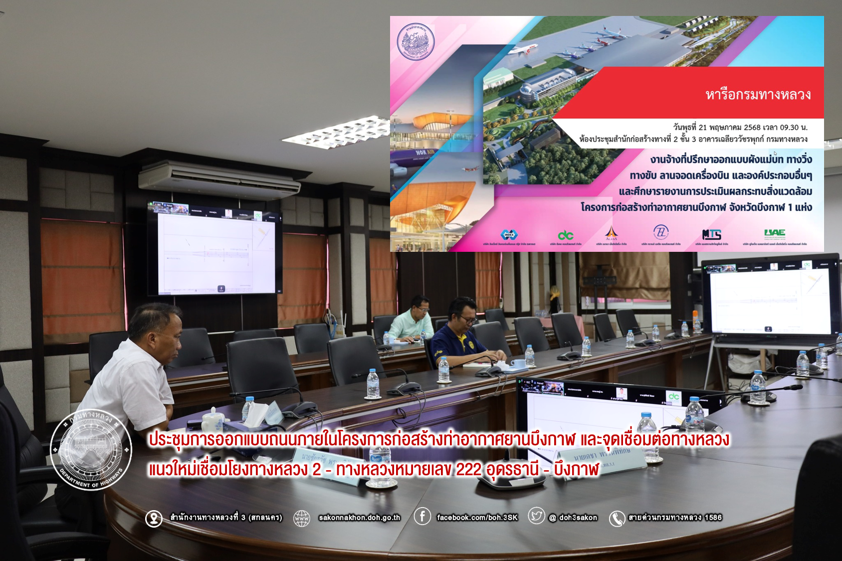 วันที่ 21 พฤษภาคม 2568 เวลา 10.00 น.นายประวัติ เสวตวงษ์ รองผู้อำนวยการสำนักงานทางหลวงที่ 3 พร้อมด้วย วิศวกรโยธา ส่วนแผนงาน เข้าร่วมประชุมการออกแบบถนนภายในโครงการก่อสร้างท่าอากาศยานบึงกาฬ และจุดเชื่อมต่อทางหลวงแนวใหม่เชื่อมโยงทางหลวง 2 - ทางหลวงหมายเลข 222 อุดรธานี - บึงกาฬ ผ่านสื่ออิเล็กทรอนิกส์ โปรแกรม Zoom ณ ห้องประชุมทวีพัฒน์ ตินะมาส ชั้น 3 อาคารหลังใหม่ โดยมี นายสิทธิชัย บุญสะอาด วิศวกรใหญ่ด้านสำรวจและออกแบบ เป็นประธานฯ