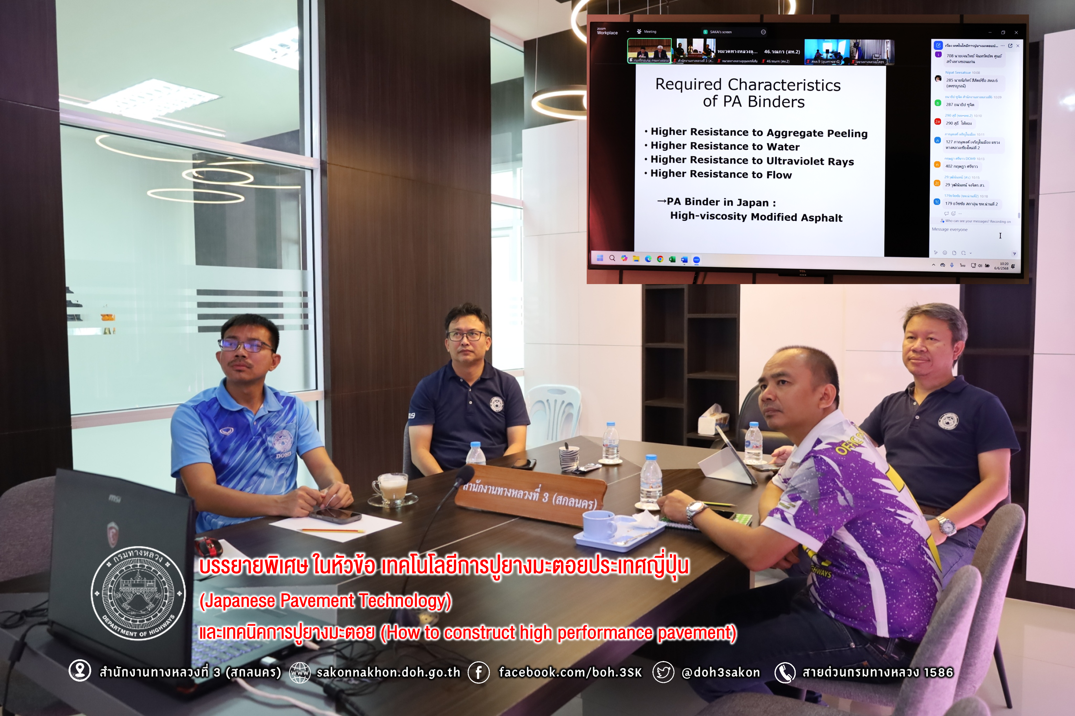 วันที่ 6 มิถุนายน 2568 เวลา 09.00 น. วิศวกรโยธา/นายช่างโยธา ส่วนแผนงาน ได้รับมอบหมายจากผู้อำนวยการสำนักงานทางหลวงที่ 3 ให้เข้าร่วมรับฟังการบรรยายพิเศษ ในหัวข้อ เทคโนโลยีการปูยางมะตอยประเทศญี่ปุ่น (Japanese Pavement Technology) และเทคนิคการปูยางมะตอย (How to construct high performance pavement) เพื่อให้เกิดความรู้ความเข้าใจเกี่ยวกับเทคโนโลยีการปูยางมะตอยและเทคนิคการก่อสร้างผิวทางคุณภาพสูงตามแนวทางของประเทศญี่ปุน และแนวทางการรีไซเคิลวัสดุแอสฟัลต์ในงานทางซึ่งเป็นแนวปฏิบัติที่ส่งเสริมการใช้ทรัพยากรอย่างคุ้มค่าและเป็นมิตรต่อสิ่งแวดล้อม ผ่านระบบ Zoom Cloud Meeting ณ ห้องประชุมชั้น 2 อาคารหลังใหม่ สำนักงานทางหลวงที่ 3 (สกลนคร)