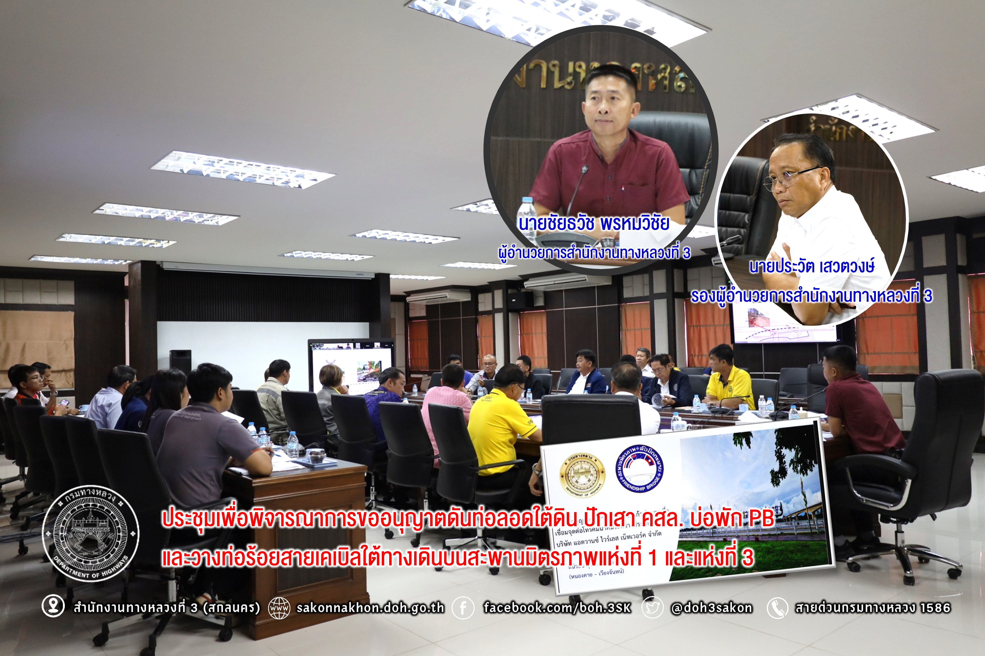 วันที่ 24 มิถุนายน 2568 เวลา 10.00 น.นายชัยธวัช พรหมวิชัย ผู้อำนวยการสำนักงานทางหลวงที่ 3 ประธานคณะกรรมการบริหารด่านสะพานมิตรภาพ เป็นประธานประชุมเพื่อพิจารณาการขออนุญาตดันท่อลอดใต้ดิน ปักเสา คสล. บ่อพัก PB และวางท่อร้อยสายเคเบิลใต้ทางเดินบนสะพานมิตรภาพแห่งที่ 1 และแห่งที่ 3 โดยมี นายประวัติ เสวตวงษ์ รองผู้อำนวยการสำนักงานทางหลวงที่ 3 พร้อมด้วยนายพิชญ รุ่งเรืองวิโรจน์ ผู้อำนวยการแขวงทางหลวงนครพนม, ผู้อำนวยการส่วนแผนงาน ผู้อำนวยการส่วนอำนวยความปลอดภัย และผู้อำนวยการส่วนฎหมายและกรรมสิทธิ์ที่ดิน, ผู้จัดการด่านสะพานมิตรภาพทั้ง 3แห่ง , และเจ้าหน้าที่ที่เกี่ยวข้องฯ เข้าร่วมประชุมคณะกรรมการบริหารงานด่านสะพานมิตรภาพ (ในเขตพื้นที่ควบคุมของสำนักงานทางหลวงที่ 3) เพื่อพิจารณาการขออนุญาตดันท่อลอดใต้ดิน ปักเสา คสล. บ่อพัก PB และวางท่อร้อยสายเคเบิลใต้ทางเดินบนสะพานมิตรภาพแห่งที่ 3 (นครพนม - คำม่วน) และการขออนุญาตเพื่อสร้างบ่อPB ปักเสาและขุดฝังและขุดท่อร้อยสายเคเบิลในเขตทางหลวง และบนสะพานมิตรภาพแห่งที่ 1 (สะพานมิตรภาพไทย - ลาว) ณ ห้องประชุมทวีพัฒน์ตินะมาส ชั้น 3 โดยมีแขวงทางหลวงในสังกัดฯ, ศูนย์สร้างและบูรณะสะพานที่ 2 (ขอนแก่น) และผู้แทนสำนักสำรวจและออกแบบ เข้าร่วมประชุมออนไลน์ผ่านทางระบบ Zoom Cloud Meeting