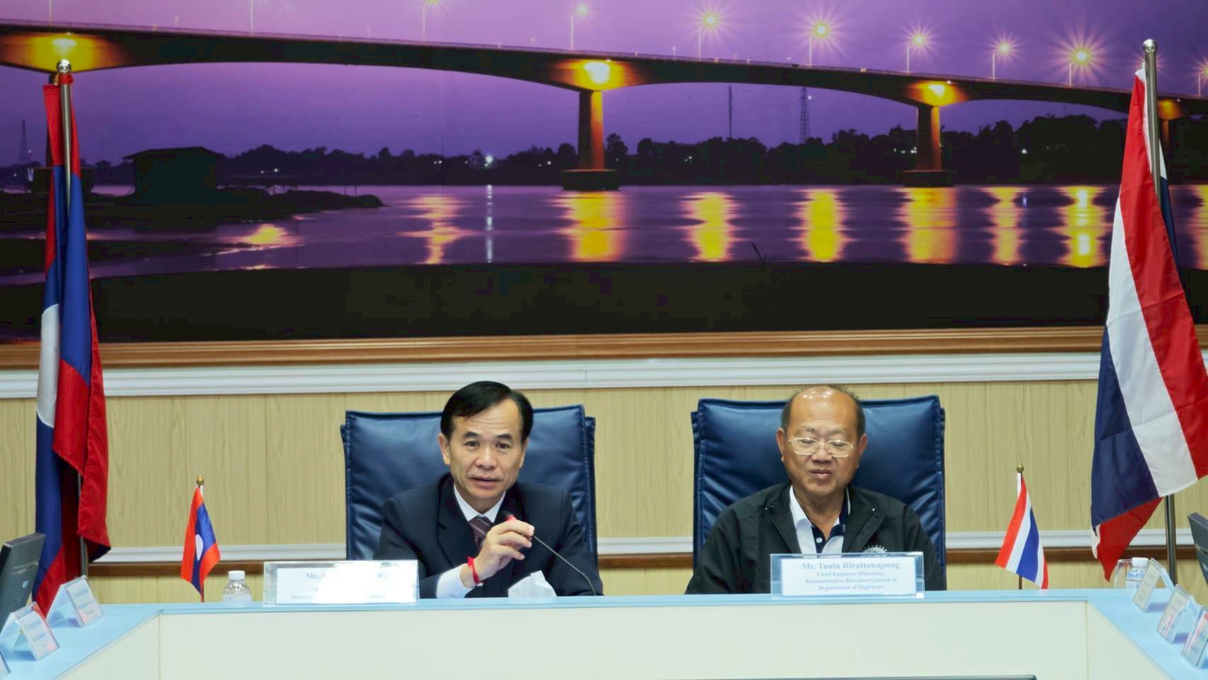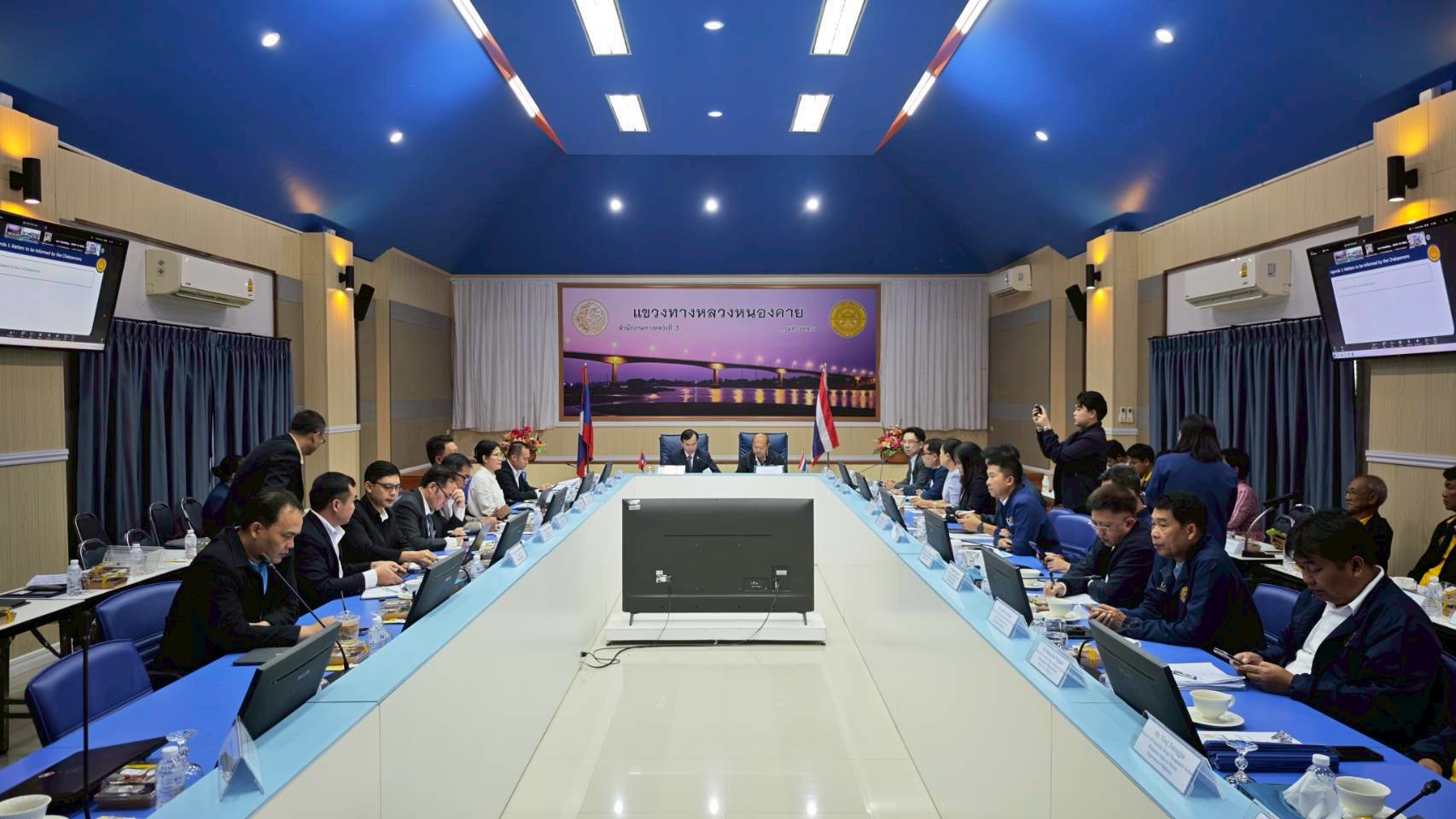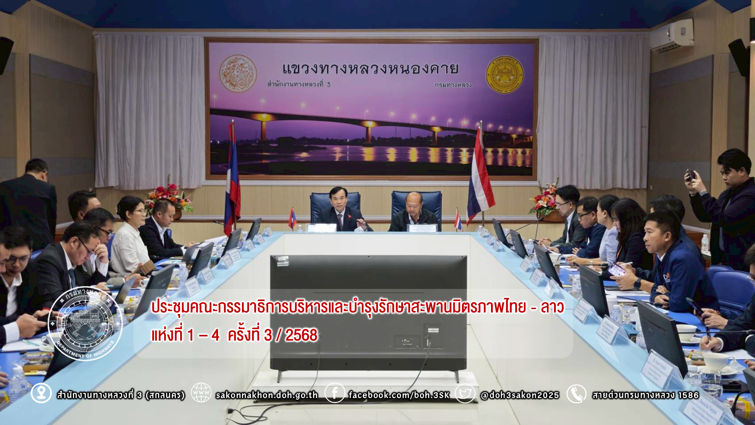 วันที่ 8 กรกฎาคม 2568 นายธานินทร์ ริรัตนพงษ์ วิศวกรใหญ่ด้านวางแผนและวางโครงการก่อสร้าง กรมทางหลวง เป็นประธานการประชุมฝ่ายไทยและนายอาดนาดา บูลม รองอธิบดีกรมขัวทาง สปป.ลาว เป็นประธานการประชุมฝ่ายลาว ในการประชุมคณะกรรมาธิการบริหารและบำรุงรักษาสะพานมิตรภาพไทย - ลาว แห่งที่ 1 – 4 โดยมีนายธันวิน สวัสดิศานต์ ผู้อำนวยการสำนักบริหารโครงการทางหลวงระหว่างประเทศ นายชัยธวัช พรหมวิชัย ผู้อำนวยการสำนักงานทางหลวงที่ 3 นายมะนูญ ชูตรี ผู้อำนวยการแขวงทางหลวงหนองคาย และนายพิชญ รุ่งเรืองวิโรจน์ ผู้อำนวยการแขวงทางหลวงนครพนม พร้อมด้วยคณะกรรมาธิการฯ ฝ่ายไทยและฝ่ายลาว และเจ้าหน้าที่ที่เกี่ยวข้องเข้าร่วมประชุม ณ ห้องประชุมอาคารอเนกประสงค์ หน่วยบำรุงรักษาสะพานมิตรภาพ (หนองคาย - เวียงจันทน์) แขวงทางหลวงหนองคาย กรมทางหลวง จังหวัดหนองคาย และผ่านสื่ออิเล็กทรอนิกส์ (Zoom Video Conference)