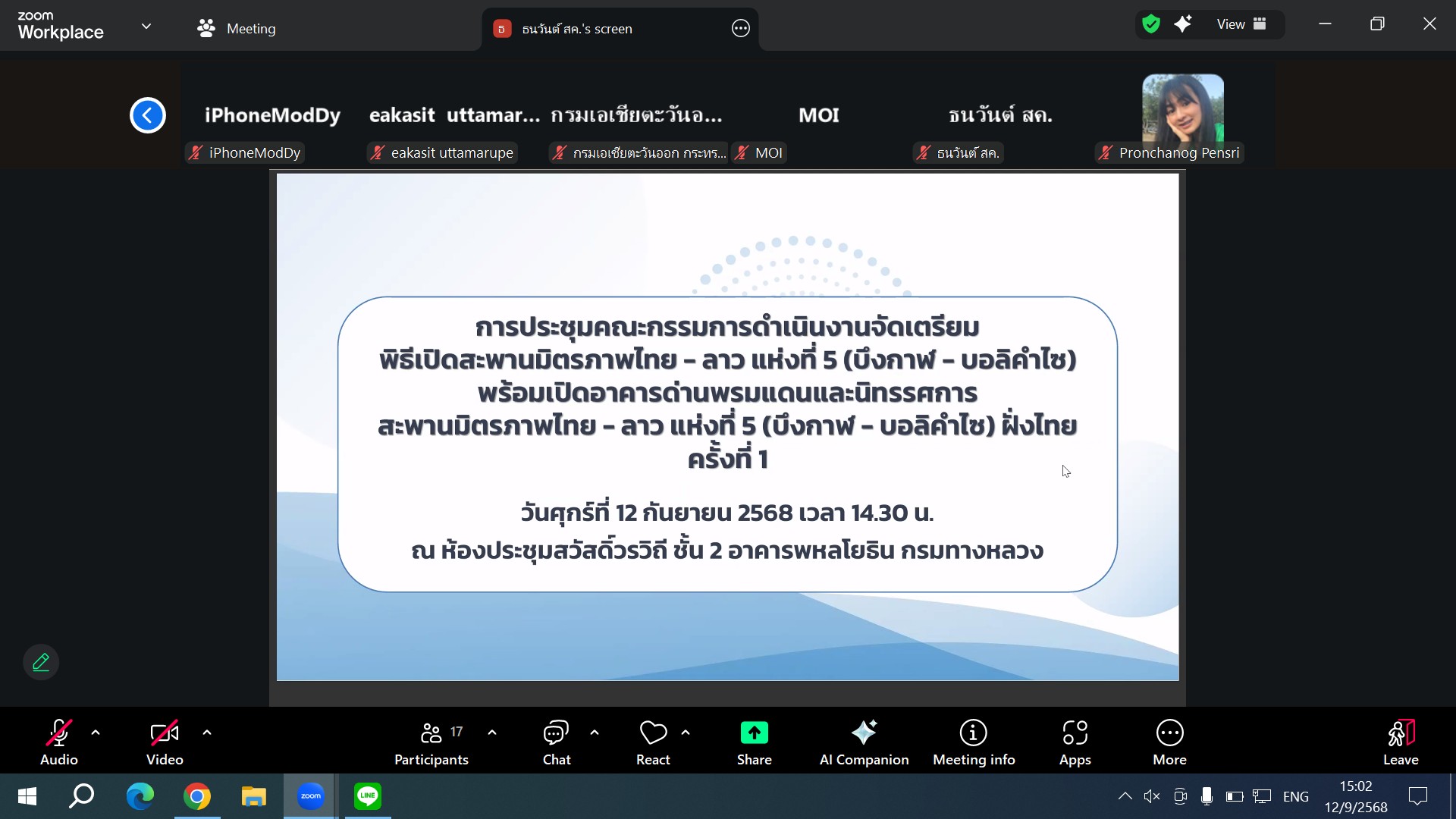 และในเวลา 14.30 ประชุมคณะกรรมการดำเนินงานจัดเตรียมพิธีเปิดสะพานมิตรภาพไทย – ลาว แห่งที่ 5 (บึงกาฬ - บอลิคำไซ) พร้อมเปิดอาคารด่านพรมแดนและนิทรรศการ สะพานมิตรภาพ ไทย - ลาว แห่งที่ 5 (บึงกาฬ - บอลิคำไซ) ฝั่งไทย ครั้งที่ 1 ในช่วงเดือนธันวาคม พ.ศ.2568 ในที่จะถึงเพื่อเป็นการฉลองความสำเร็จในการดำเนินโครงการก่อสร้าง และเป็นการฉลองสถาปนาความสัมพันธ์ทางการทูตไทย - สปป.ลาว ครบ 75 ปี และดำเนินงานจัดเตรียมพิธีดังกล่าว ให้เป็นไปด้วยความเรียบร้อย สมบูรณ์และสมเกียรติ ณ ห้องประชุมสวัสดิ์วรวิถี กรมทางหลวง และผ่านสื่ออิเล็กทรอนิกส์ (Zoom Cloud Meeting) ณ ห้องประชุมทวีพัฒน์ ตินะมาส ชั้น 3 อาคารหลังใหม่