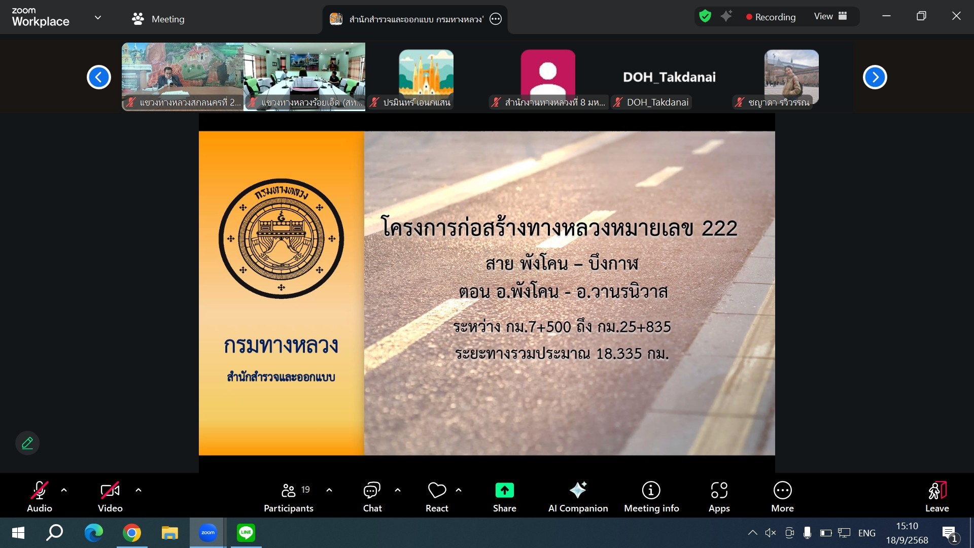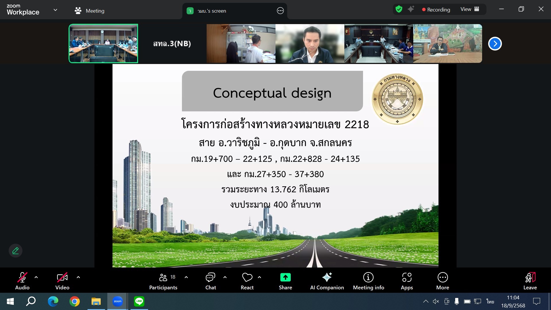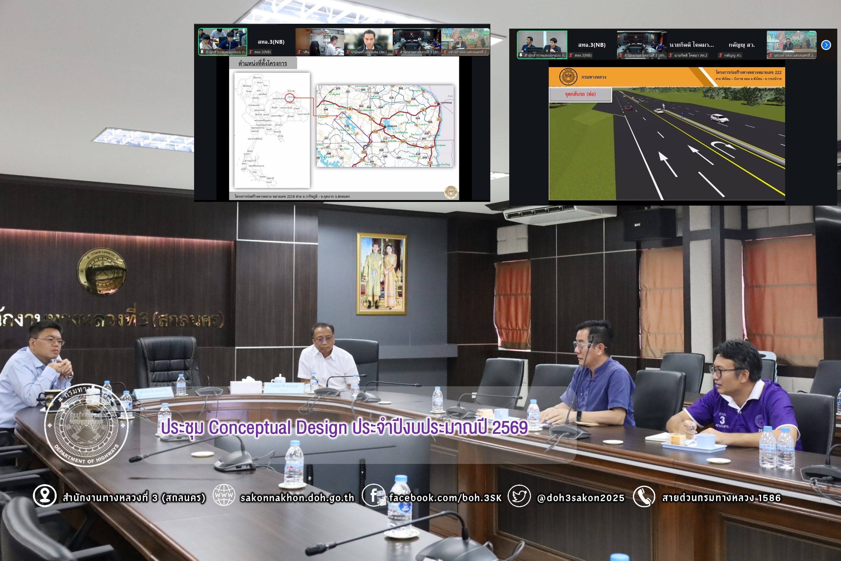 วันที่ 18 กันยายน 2568 เวลา 10.00 - 16.30 น.นายชัยธวัช พรหมวิชัย ผู้อำนวยการสำนักงานทางหลวงที่ 3 ได้มอบหมายให้ นายเดชา พรวนพิทักษ์ รองผู้อำนวยการสำนักงานทางหลวงที่ 3 ตำแหน่งที่ 1 และนายประวัติ เสวตวงษ์ รองผู้อำนวยการสำนักงานทางหลวงที่ 3 ตำแหน่งที่ 2, นายนายธนัชพงศ์ เลิศปิติพิทักษ์ ผู้อำนวยการส่วนสำรวจและออกแบบ และวิศวกรโยธาส่วนแผนงาน ให้เข้าร่วมประชุม Conceptual Design ประจำปีงบประมาณปี 2569 เพื่อพิจารณาแนวทางในการออกแบบให้เหมาะสม และเกิดประโยชน์สูงสุดกับโครงการฯ ทั้งหมด 3โครงการ ดังนี้
