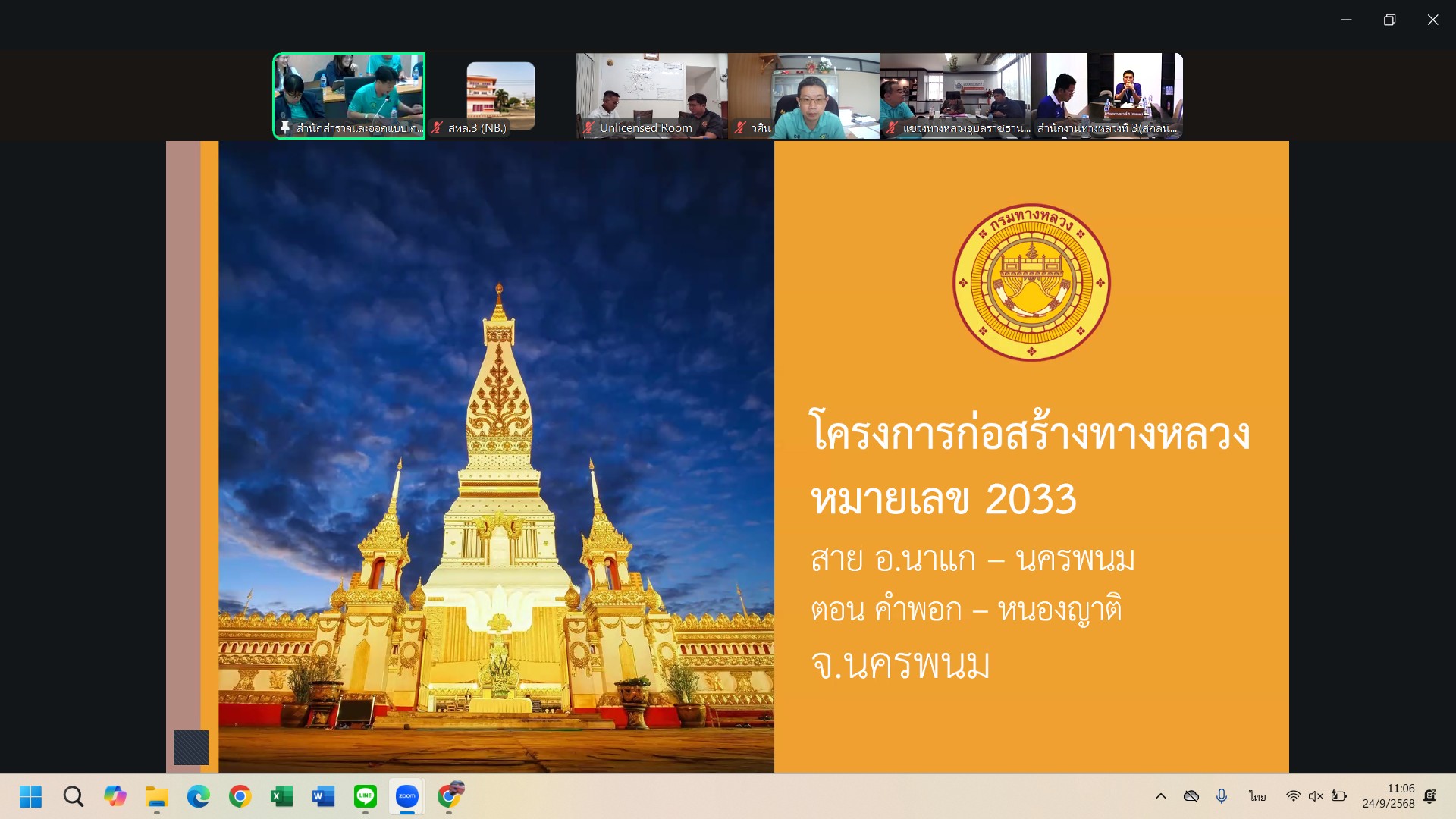 ประชุมผ่านสื่ออิเล็กทรอนิกส์ โปรแกรม Zoom ณ ห้องประชุมชั้น 2 อาคารหลังใหม่ สำนักงานทางหลวงที่ 3 (สกลนคร) โดยมี นายสิทธิชัย บุญสะอาด วิศวกรใหญ่ด้านสำรวจและออกแบบ เป็นประธานฯ