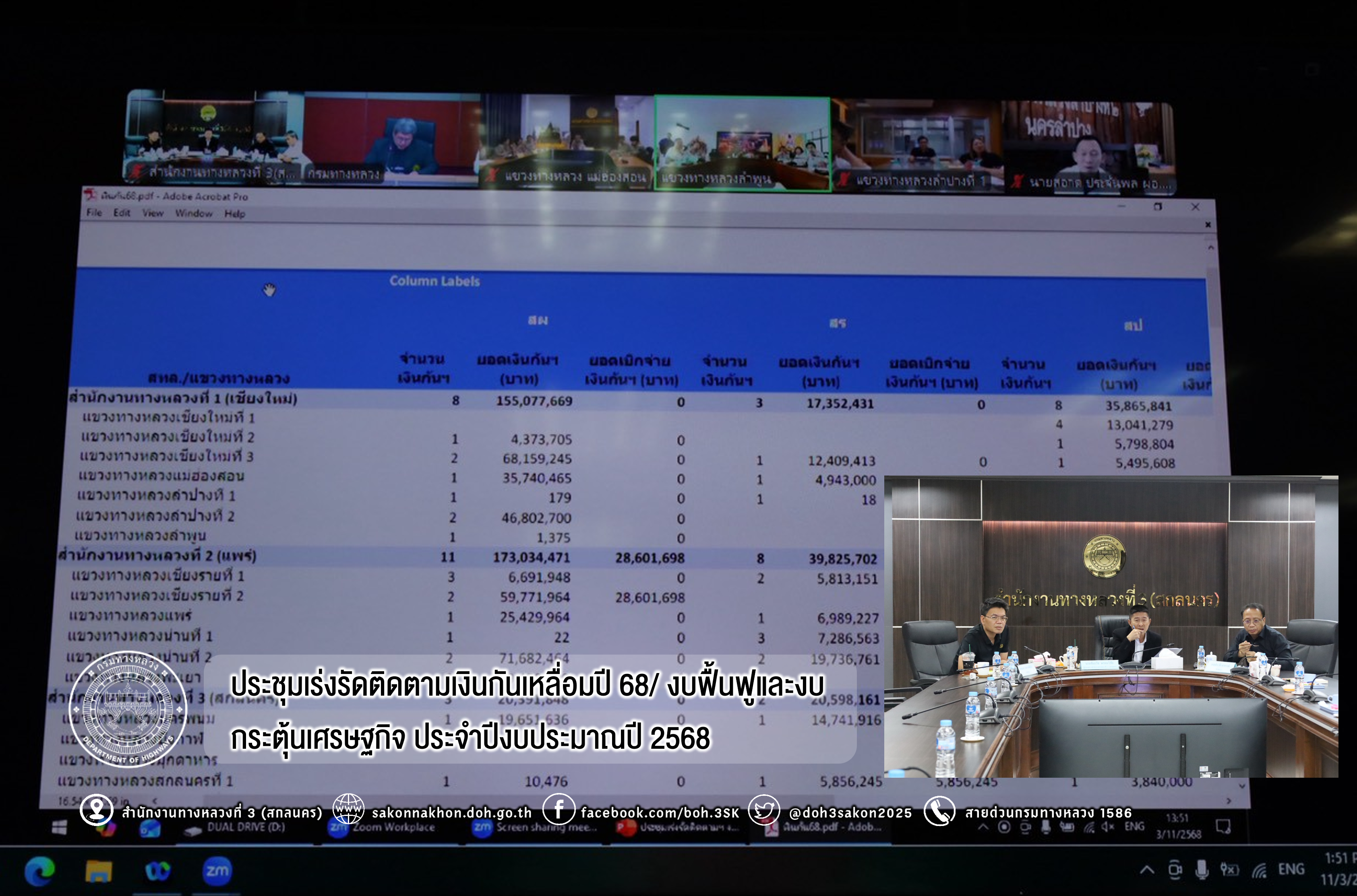 นายชัยธวัช พรหมวิชัย ผู้อำนวยการสำนักงานทางหลวงที่ 3 พร้อมด้วย นายเดชา พรวนพิทักษ์ รองผู้อำนวยการสำนักงานทางหลวงที่ 3 ตำแหน่งที่ 1, นายประวัติ เสวตวงษ์ รองผู้อำนวยการสำนักงานทางหลวงที่ 3 ตำแหน่งที่ 2 นายชินนพัทธ์ มุลทาทอง ผู้อำนวยการส่วนแผนงาน, และวิศวกรโยธา/นายช่างโยธา ส่วนแผนงาน ได้เข้าร่วมประชุมเร่งรัดติดตามเงินกันเหลื่อมปี68 / งบฟื้นฟู และงบกระตุ้นเศรษฐกิจ ประจำปีงบประมาณปี 2568 ผ่านสื่ออิเล็กทรอนิกส์ (Zoom Video Conference) ณ ห้องประชุมทวีพัฒน์ ตินะมาส ชั้น 3 (อาคารหลังใหม่) โดยมี นายเสริมศักดิ์ นัยนันท์ รองอธิบดีฝ่ายบำรุงทาง เป็นประธานฯ