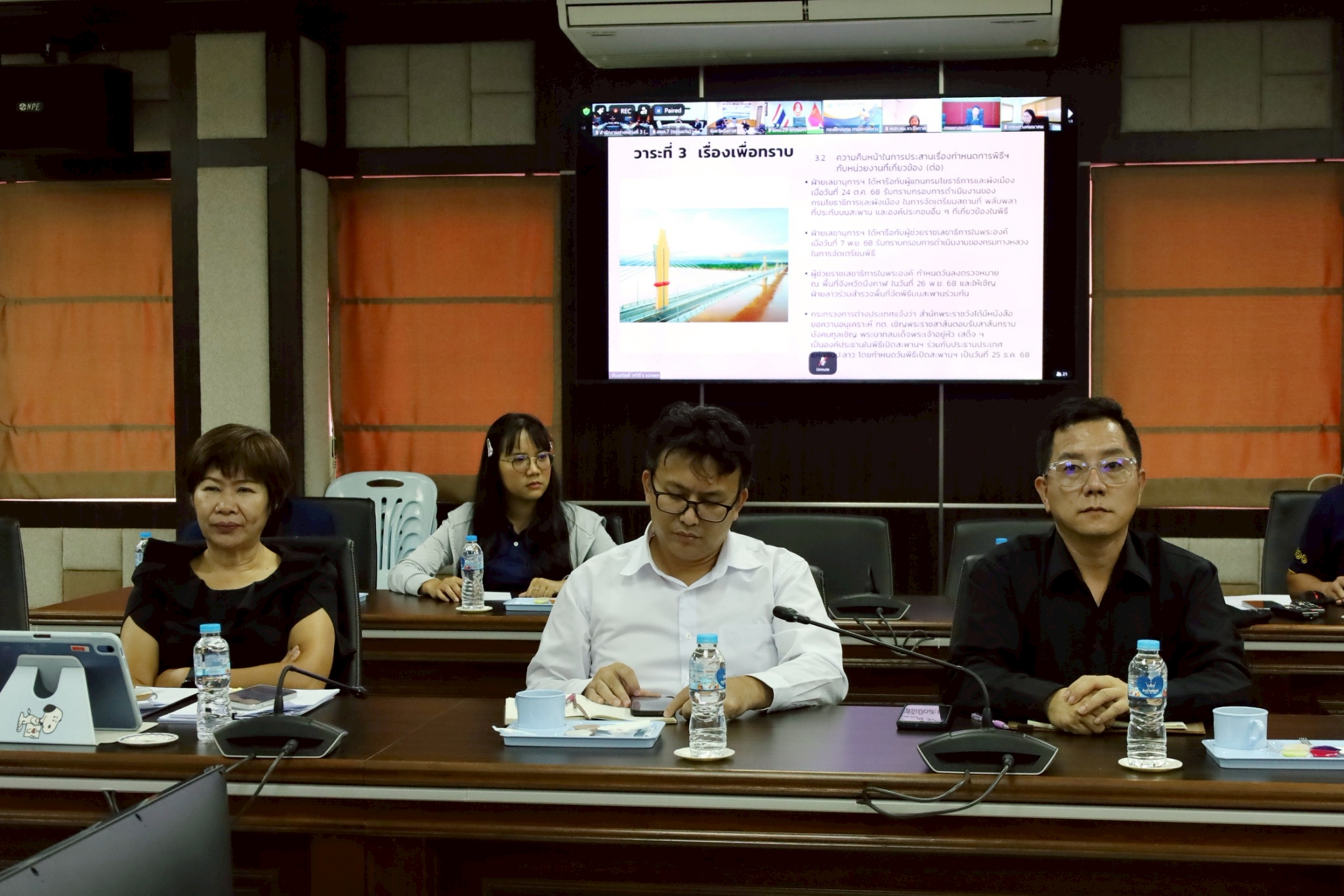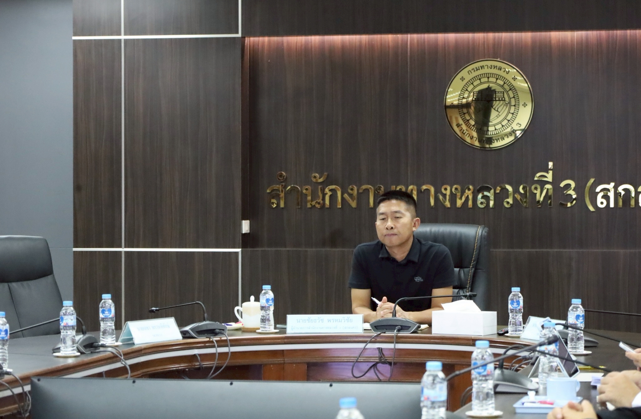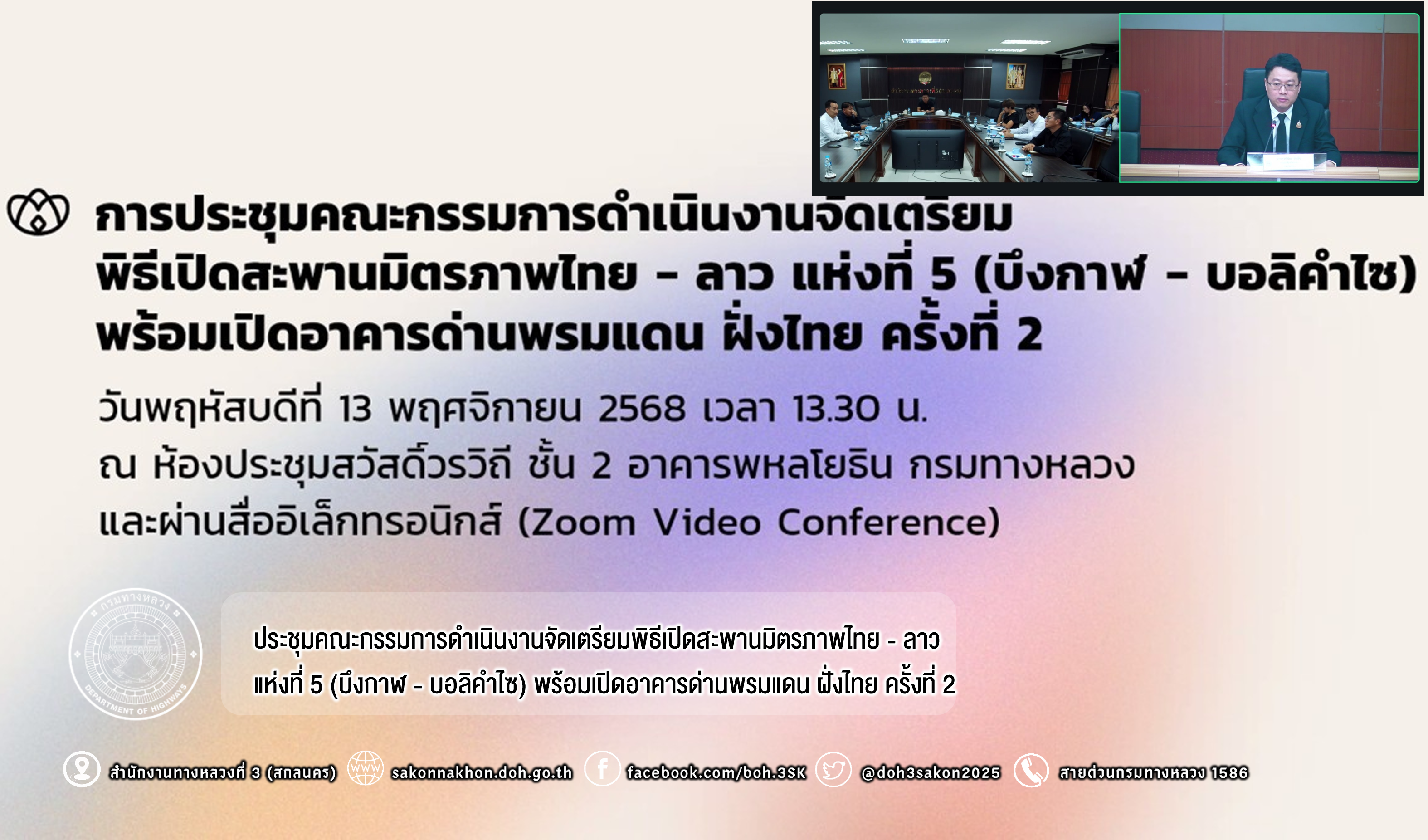 วันที่ 13 พฤศจิกายน 2568 เวลา 13.30 น.นายชัยธวัช พรหมวิชัย ผู้อำนวยการสำนักงานทางหลวงที่ 3 พร้อมด้วย นางนภาพิศ สุวรรณศรี ผู้อำนวยการส่วนบริหาร, นายชินนพัทธ์ มุลทาทอง ผู้อำนวยการส่วนแผนงาน, นายหนูกาญ เจริญไชย ผู้อำนวยการส่วนกฎหมายและกรรมสิทธิ์ที่ดิน, นายธนัชพงศ์ เลิศปิติพิทักษ์ ผู้อำนวยการส่วนสำรวจและออกแบบ และนิติกร / วิศวกรโยธาส่วนแผนงาน ได้เข้าร่วมประชุมคณะกรรมการดำเนินงานจัดเตรียมพิธีเปิดสะพานมิตรภาพไทย - ลาว แห่งที่ 5 (บึงกาฬ - บอลิคำไซ) พร้อมเปิดอาคารด่านพรมแดน ฝั่งไทย ครั้งที่ 2 เพื่อติดตามความคืบหน้าในการจัดเตรียมพิธีฯ ผ่านสื่ออิเล็กทรอนิกส์ (Zoom Video Conference) ณ ห้องประชุมทวีพัฒน์ ตินะมาส ชั้น 3 โดยมี นายพงษ์พันธ์ จั่นเงิน รองอธิบดีฝ่ายวิชาการ เป็นประธานฯ