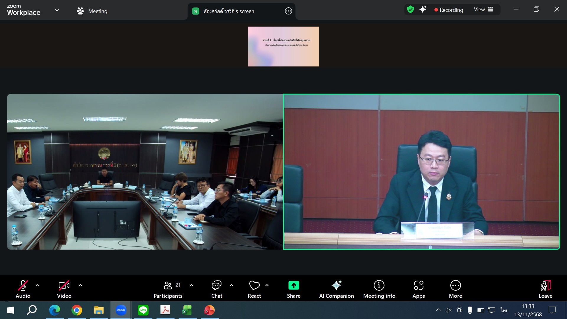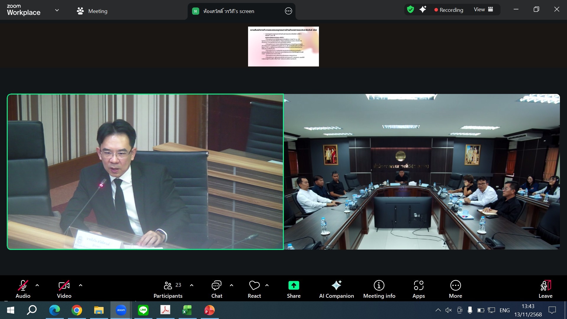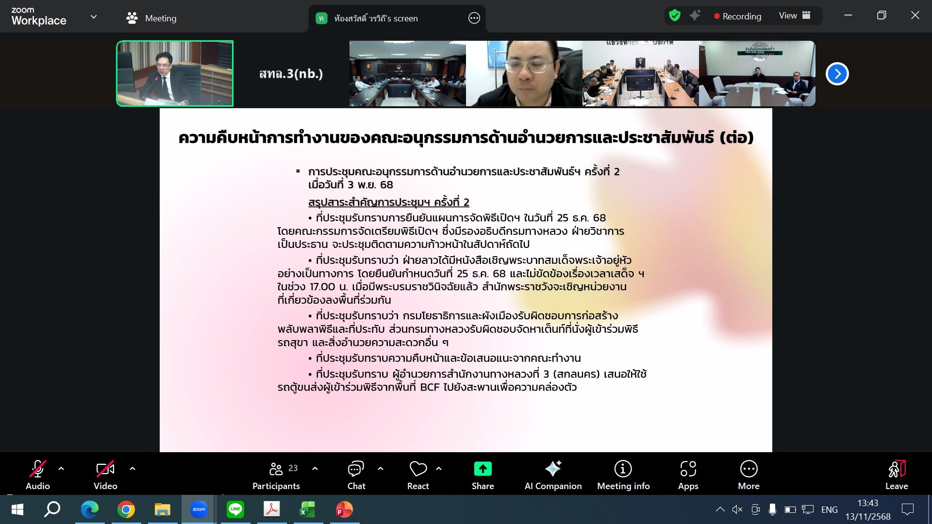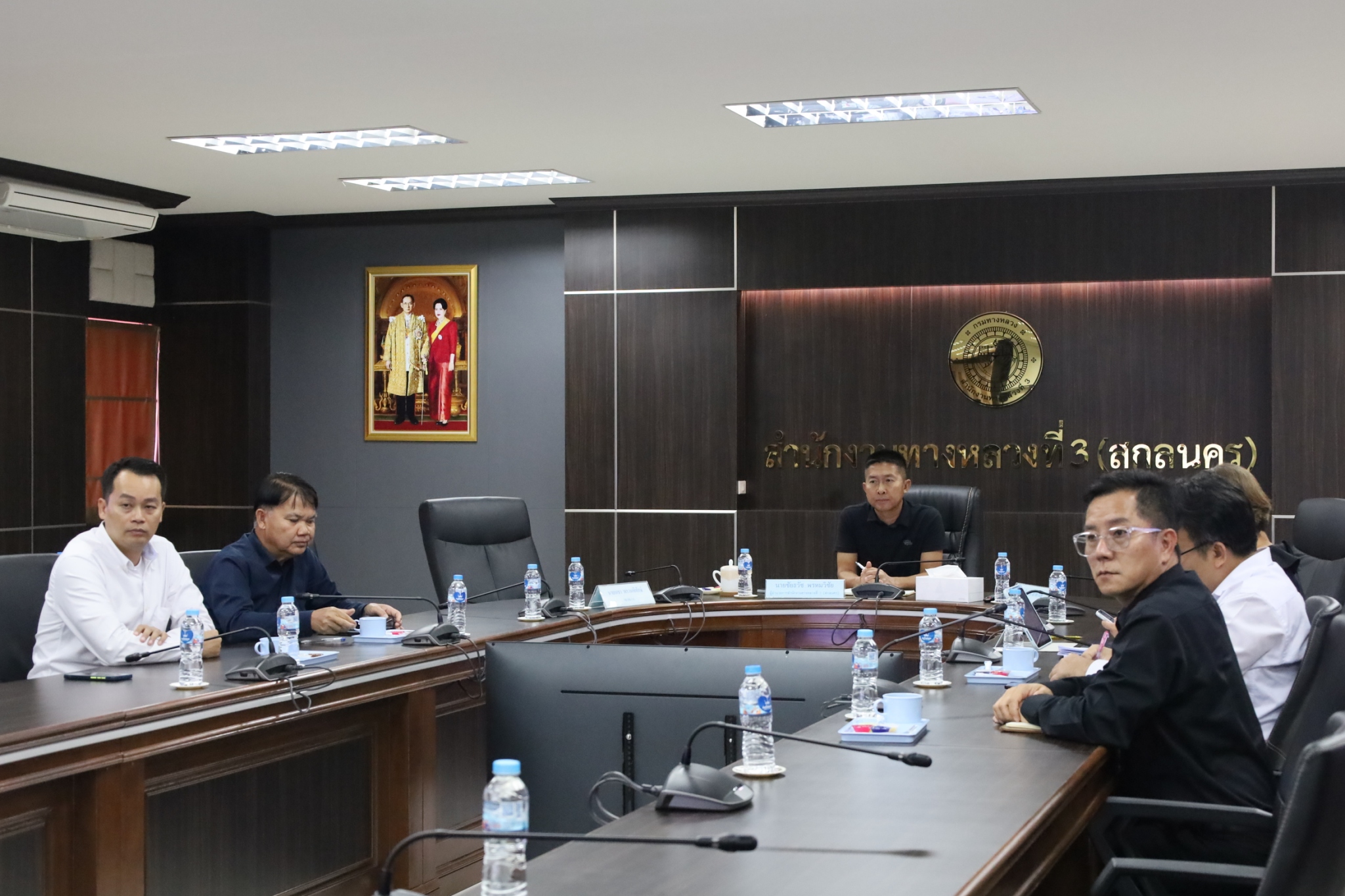 วันที่ 13 พฤศจิกายน 2568 เวลา 13.30 น.นายชัยธวัช พรหมวิชัย ผู้อำนวยการสำนักงานทางหลวงที่ 3 พร้อมด้วย นางนภาพิศ สุวรรณศรี ผู้อำนวยการส่วนบริหาร, นายชินนพัทธ์ มุลทาทอง ผู้อำนวยการส่วนแผนงาน, นายหนูกาญ เจริญไชย ผู้อำนวยการส่วนกฎหมายและกรรมสิทธิ์ที่ดิน, นายธนัชพงศ์ เลิศปิติพิทักษ์ ผู้อำนวยการส่วนสำรวจและออกแบบ และนิติกร / วิศวกรโยธาส่วนแผนงาน ได้เข้าร่วมประชุมคณะกรรมการดำเนินงานจัดเตรียมพิธีเปิดสะพานมิตรภาพไทย - ลาว แห่งที่ 5 (บึงกาฬ - บอลิคำไซ) พร้อมเปิดอาคารด่านพรมแดน ฝั่งไทย ครั้งที่ 2 เพื่อติดตามความคืบหน้าในการจัดเตรียมพิธีฯ ผ่านสื่ออิเล็กทรอนิกส์ (Zoom Video Conference) ณ ห้องประชุมทวีพัฒน์ ตินะมาส ชั้น 3 โดยมี นายพงษ์พันธ์ จั่นเงิน รองอธิบดีฝ่ายวิชาการ เป็นประธานฯ