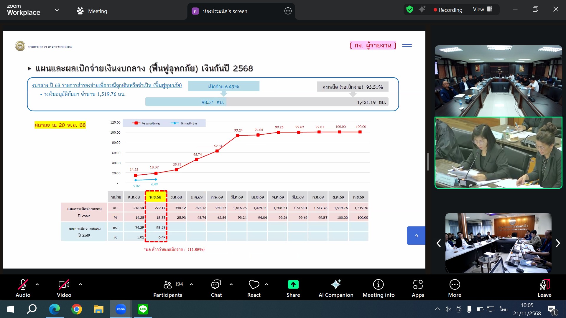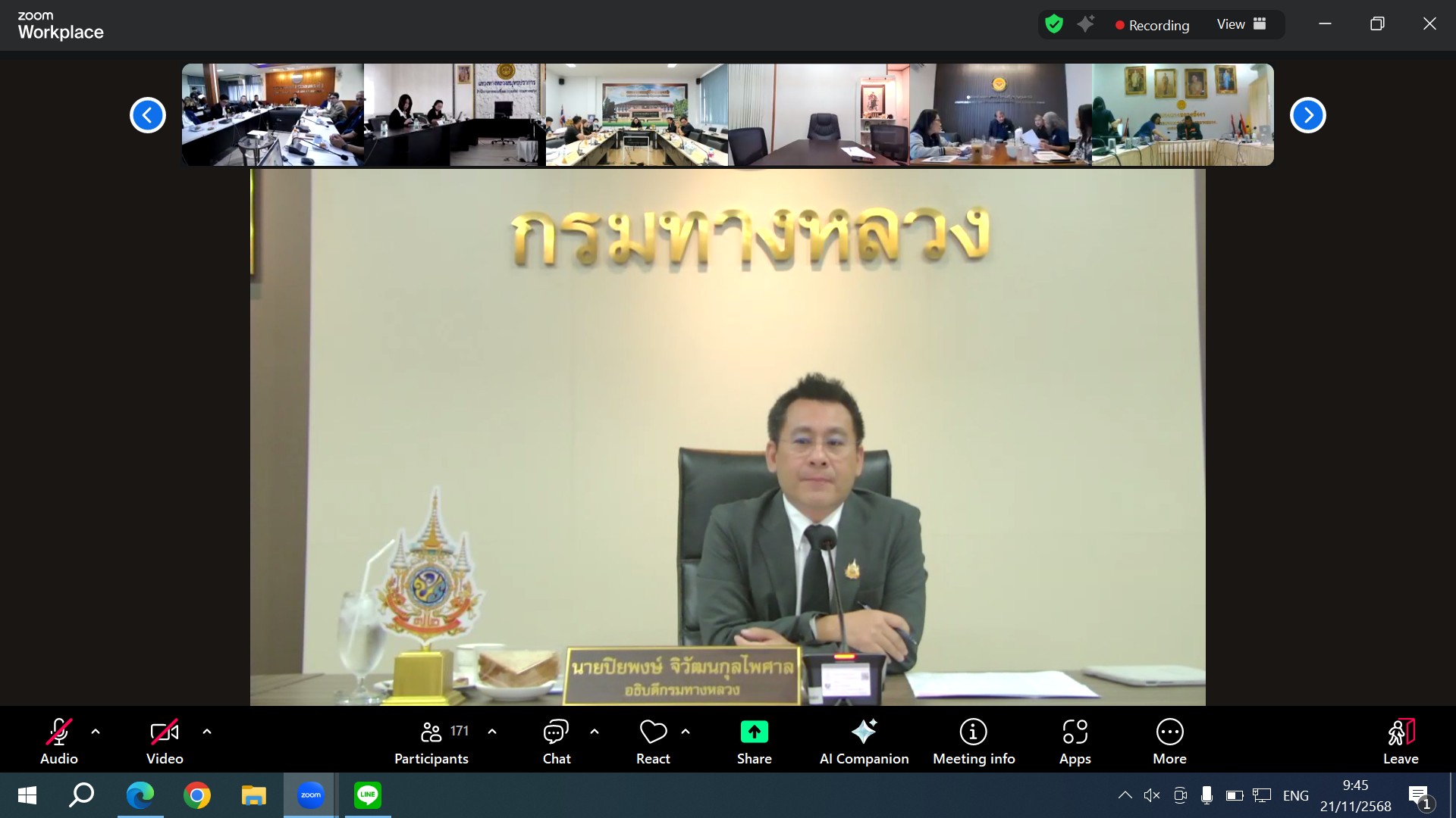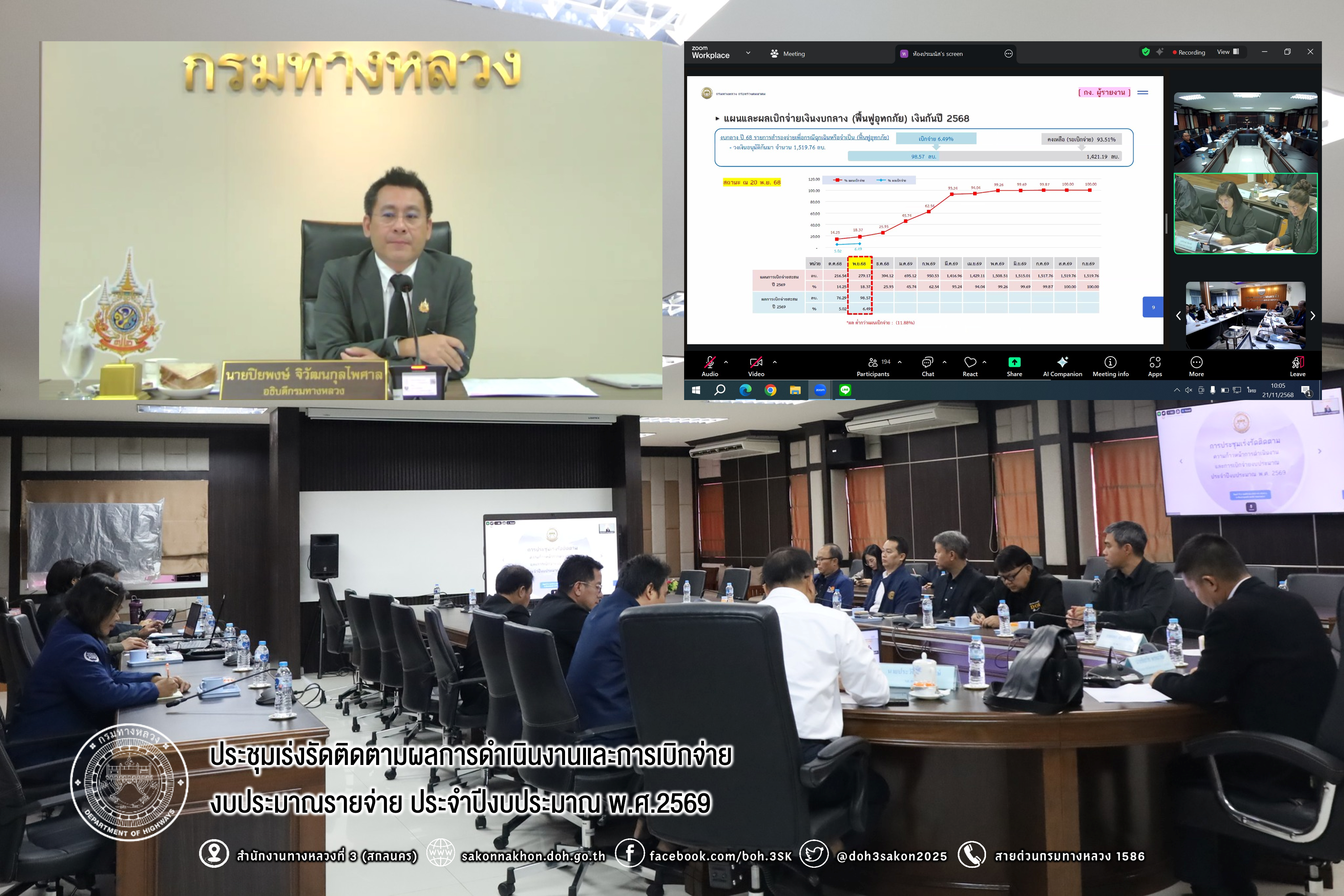 วันที่ 21 พฤศจิกายน 2568 เวลา 09.30 น.นายชัยธวัช พรหมวิชัย ผู้อำนวยการสำนักงานทางหลวงที่ 3 พร้อมด้วย นายประวัติ เสวตวงษ์ รองผู้อำนวยการสำนักงานทางหลวงที่ 3, นายชินนพัทธ์ มุลทาทอง ผู้อำนวยการส่วนแผนงาน, นายหนูกาญ เจริญไชย ผู้อำนวยการส่วนกฎหมายและกรรมสิทธิ์ที่ดิน, นายเอกชัย แสนสงค์ ผู้อำนวยการส่วนตรวจสอบฯ, นายธนัชพงศ์ เลิศปิติพิทักษ์ ผู้อำนวยการส่วนสำรวจและออกแบบ, นายนพดล สุรทิพย์ ผู้อำนวยการส่วนไฟฟ้า และเจ้าหน้าที่ที่เกี่ยวข้อง ได้เข้าร่วมประชุมเร่งรัดติดตามผลการดำเนินงานและการเบิกจ่ายงบประมาณรายจ่าย ประจำปีงบประมาณ พ.ศ.2569 เพื่อพิจารณาผลการเบิกจ่ายงบประมาณที่ได้รับในปีงบประมาณ 2568 ของกรมทางหลวง และสรุปผลการเบิกจ่าย และสถานะการดำเนินงานของงบประมาณรายจ่าย ประจำปีงบประมาณ 2569 ผ่านการประชุมทางไกลด้วยระบบ Zoom Cloud Meeting ณ ห้องประชุมทวีพัฒน์ ตินะมาส ชั้น 3 โดยมี นายปิยพงษ์ จิวัฒนกุลไพศาล อธิบดีกรมทางหลวง เป็นประธานฯ
