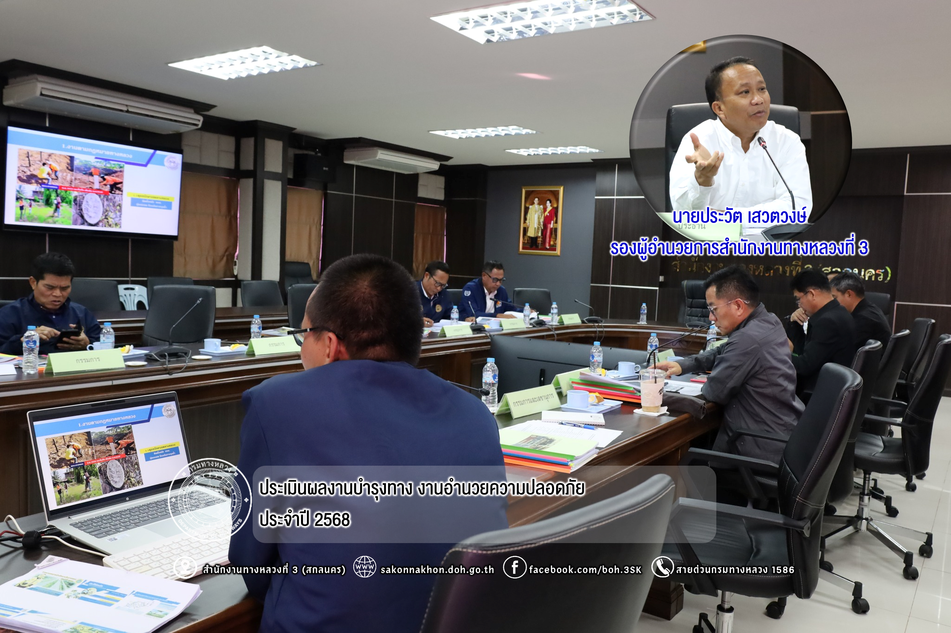 นายประวัติ เสวตวงษ์ รองผู้อำนวยการสำนักงานทางหลวงที่ 3 ตำแหน่งที่ 2 ประธานคณะกรรมการประเมินผลงานบำรุงทาง งานอำนวยความปลอดภัยประจำปี 2568 สำนักงานทางหลวงที่ 3 (สกลนคร) พร้อมคณะกรรมการ ประชุมประเมินคัดเลือกผู้อำนวยการแขวงทางหลวง หัวหน้าหมวดทางหลวง ผู้มีผลงานด้านวิศวกรรม ดี/ดีเด่น ประจำปี 2568 โดยมีผู้เข้ารับการประเมินจากแขวงทางหลวงในสังกัดฯ นำเสนอผลงาน ณ ห้องประชุมทวีพัฒน์ ตินะมาส สำนักงานทางหลวงที่ 3 (สกลนคร) ดังนี้