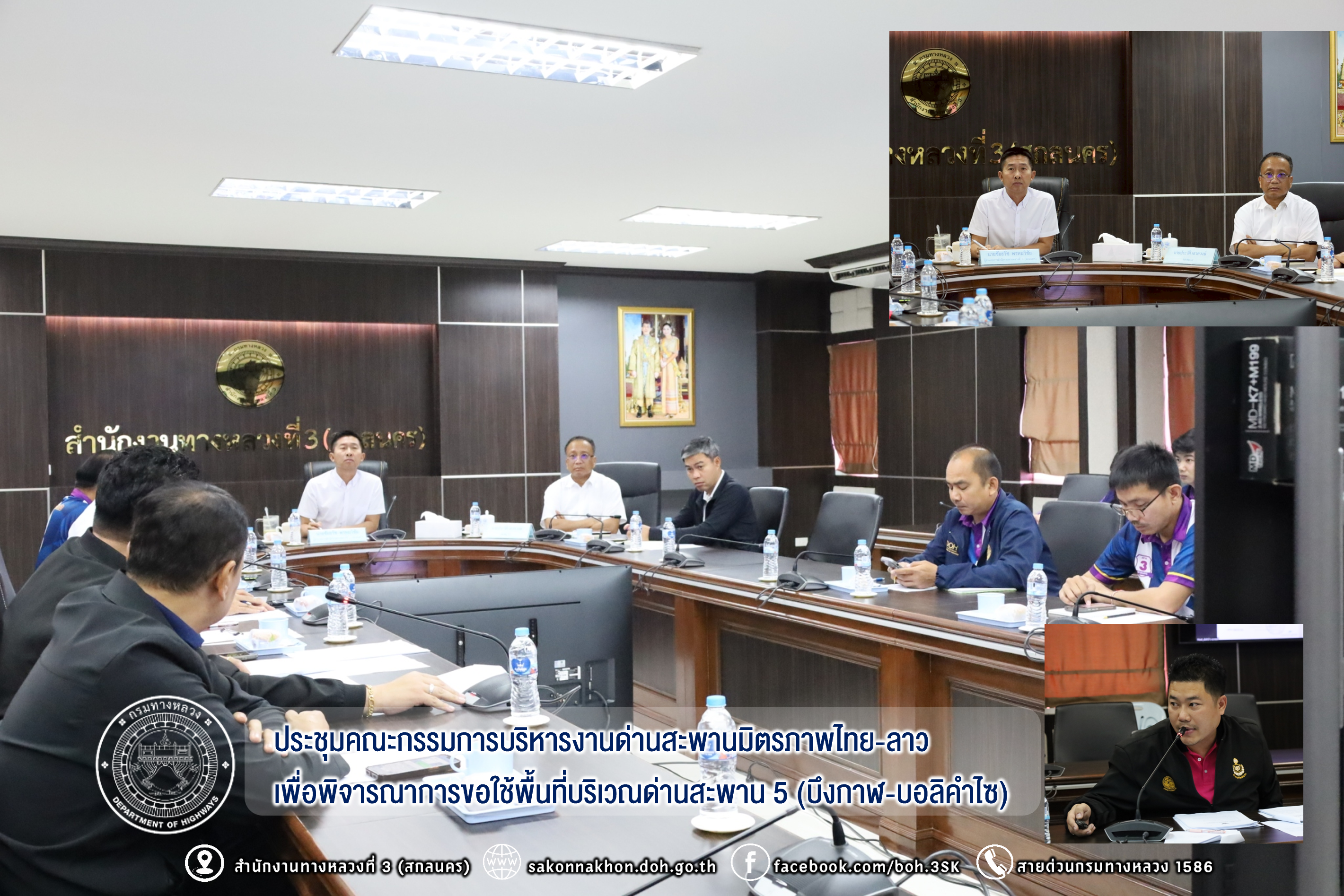 นายชัยธวัช พรหมวิชัย ผู้อำนวยการสำนักงานทางหลวงที่ 3 พร้อมด้วย นายประวัติ เสวตวงษ์ รองผู้อำนวยการสำนักงานทางหลวงที่ 3, นายชินนพัทธ์ มุลทาทอง ผู้อำนวยการส่วนแผนงาน, นายหนูกาญ เจริญไชย ผู้อำนวยการส่วนกฏหมายและกรรมสิทธิ์ที่ดิน, นิติกร และวิศวกรโยธา/นายช่างโยธา ส่วนแผนงาน และส่วนอำนวยความปลอดภัย เข้าร่วมประชุมคณะกรรมการบริหารงานด่านสะพานมิตรภาพ (ในเขตควบคุมของ สทล.3) เพื่อพิจารณาการขอใช้พื้นที่ในการจัดตั้งจุดจำหน่ายตั๋ว และขอใช้พื้นที่ช่องชานชาลาจอดรถโดยสารประจำทางระหว่างประเทศ ของ บริษัท ขนส่ง จำกัด (บขส.) บริเวณสะพานมิตรภาพไทย - ลาว แห่งที่ 5 (บึงกาฬ - บอลิคำไซ) ณ ห้องประชุมทวีพัฒน์ ตินะมาส ชั้น 3 โดยมี ผู้แทนสำนักสำรวจและออกแบบ, ศูนย์สร้างและบูรณะสะพานที่ 2 (ขอนแก่น), แขวงทางหลวงในสังกัดฯ และผู้จัดการด่านสะพานมิตรภาพ แห่งที่ 5 เข้าร่วมประชุม ณ ที่ตั้งหน่วยงานผ่านสื่ออิเล็กทรอนิกส์แอปพลิเคชั่น Zoom Cloud Meeting
