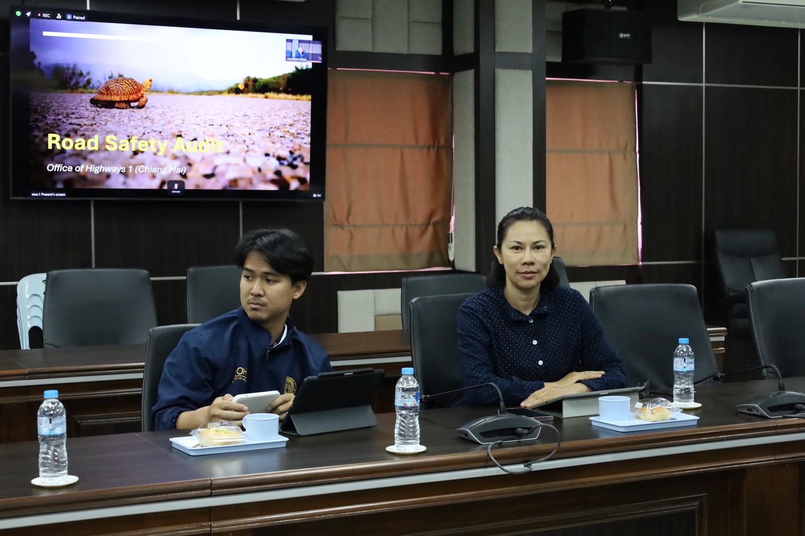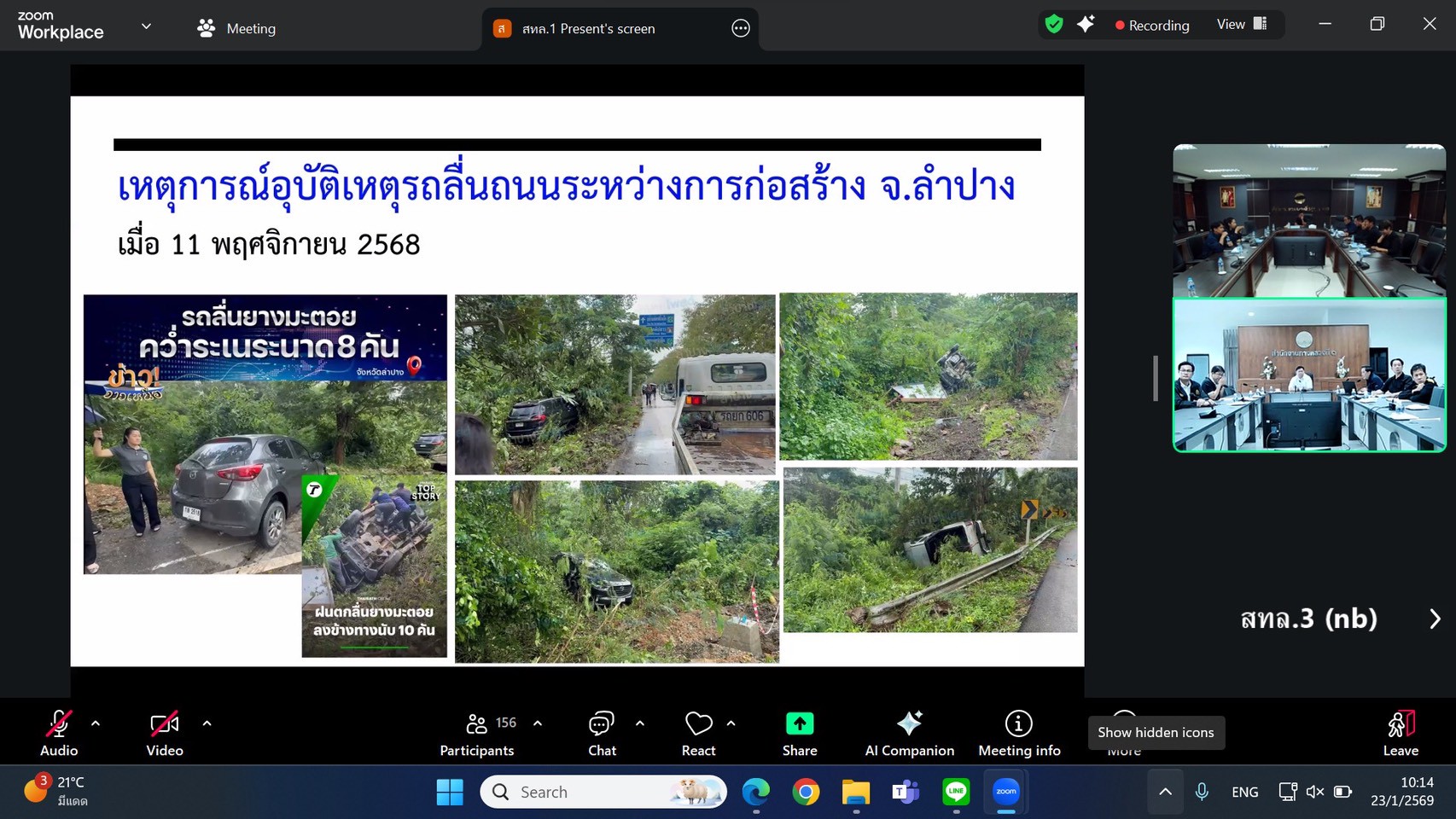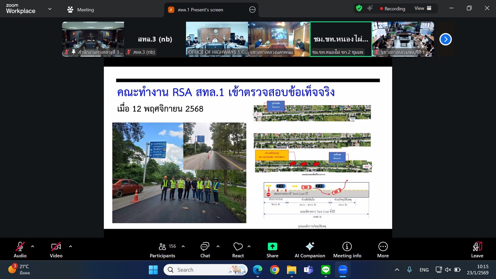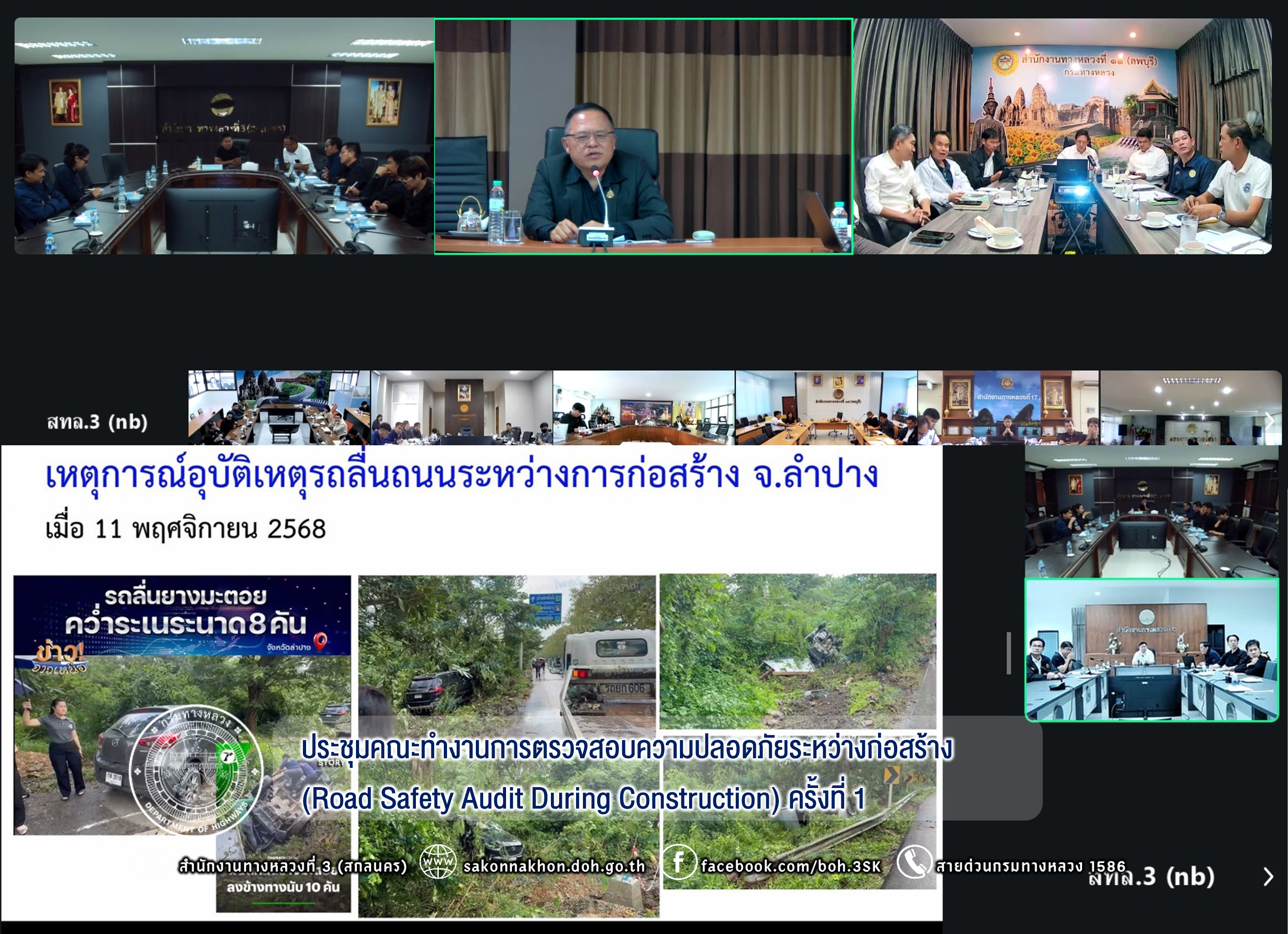 นายชัยธวัช พรหมวิชัย ผู้อำนวยการสำนักงานทางหลวงที่ 3 พร้อมด้วย นายประวัติ เสวตวงษ์ รองผู้อำนวยการสำนักงานทางหลวงที่ 3 ,นางนภาพิศ สุวรรณศรี ผู้อำนวยการส่วนบริหาร, นายธนัชพงศ์ เลิศปิติพิทักษ์ ผู้อำนวยการส่วนสำรวจและออกแบบ, นายสมชาย สุทธิบริบาล ผู้อำนวยการส่วนควบคุมงานก่อสร้างทาง และวิศวกรโยธา/นายช่างโยธา ส่วนควบคุมงานก่อสร้างทางและส่วนอำนวยความปลอดภัย ได้เข้าร่วมประชุมคณะทำงานการตรวจสอบความปลอดภัยระหว่างก่อสร้าง (Road Safety Audit During Construction) ครั้งที่ 1 /2569 ผ่านสื่ออิเล็กทรอนิกส์ แอปพลิเคชัน Zoom Cloud Meeting ณ ห้องประชุมทวีพัฒน์ ตินะมาส ชั้น 3