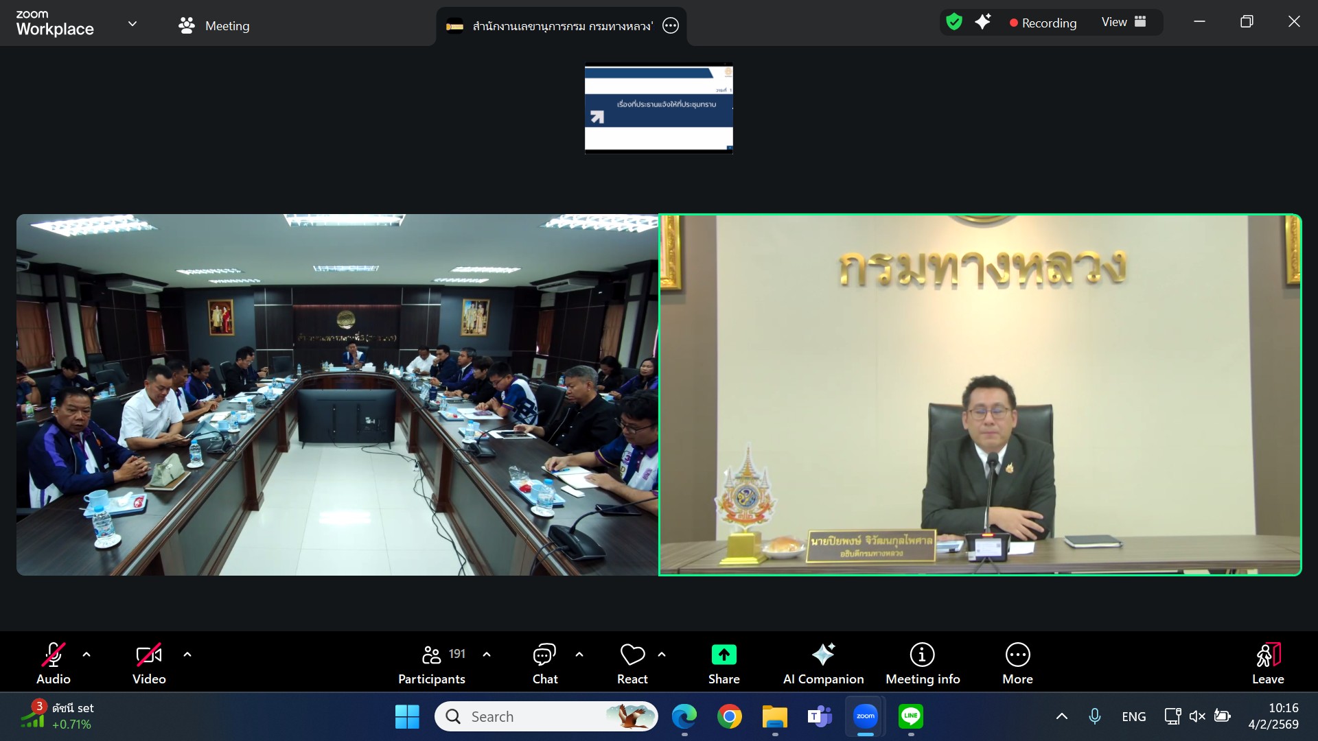 ประชุมผ่านสื่ออิเล็กทรอนิกส์ แอปพลิเคชัน Zoom Cloud Meeting ณ ห้องประชุมทวีพัฒน์ ตินะมาส ชั้น 3 อาคารหลังใหม่ โดยมี นายปิยพงษ์ จิวัฒนกุลไพศาล อธิบดีกรมทางหลวง เป็นประธานฯ