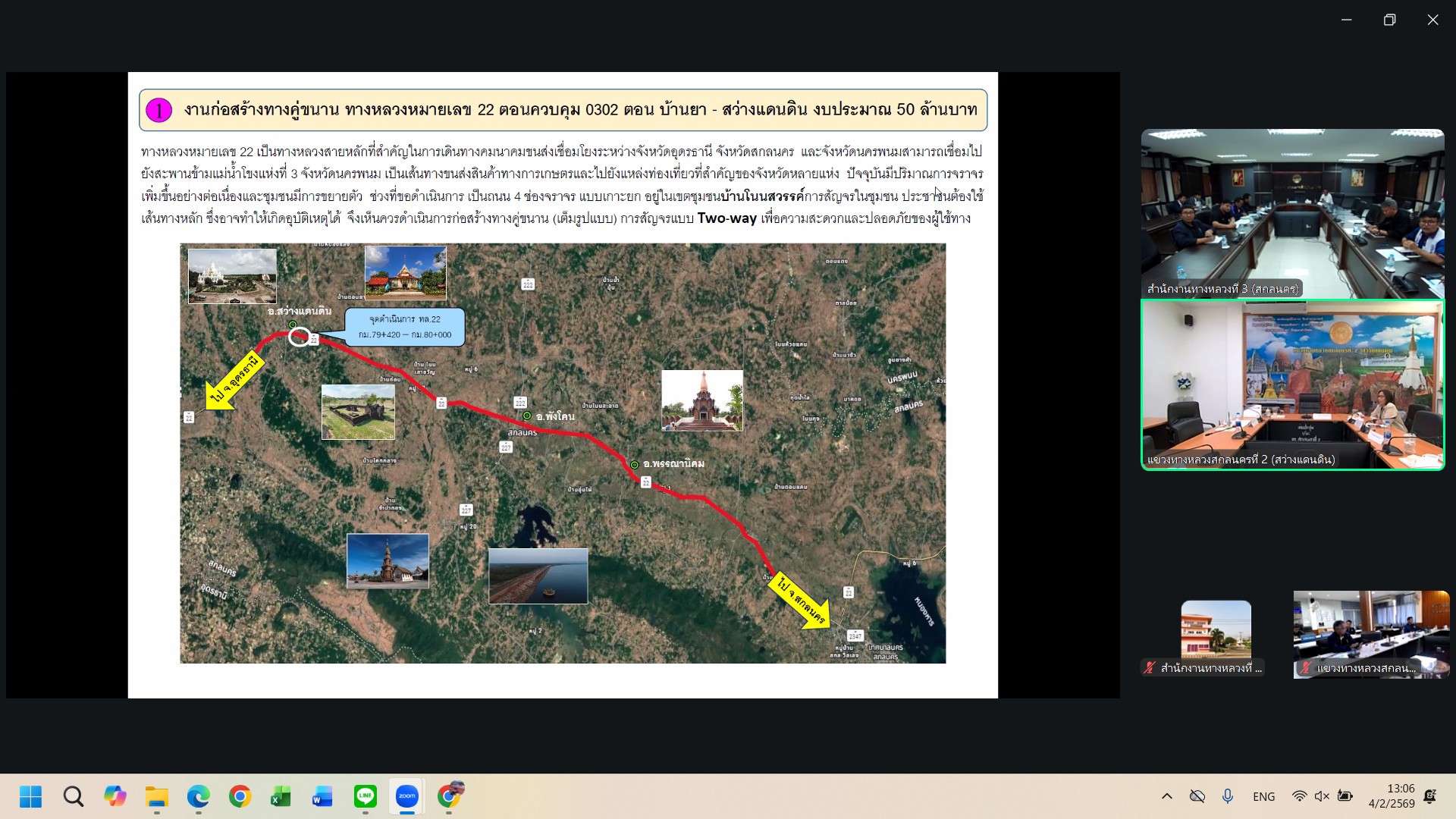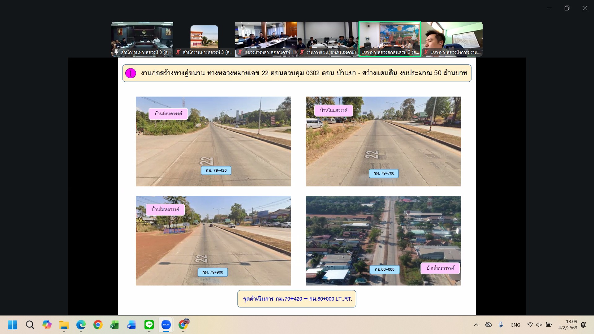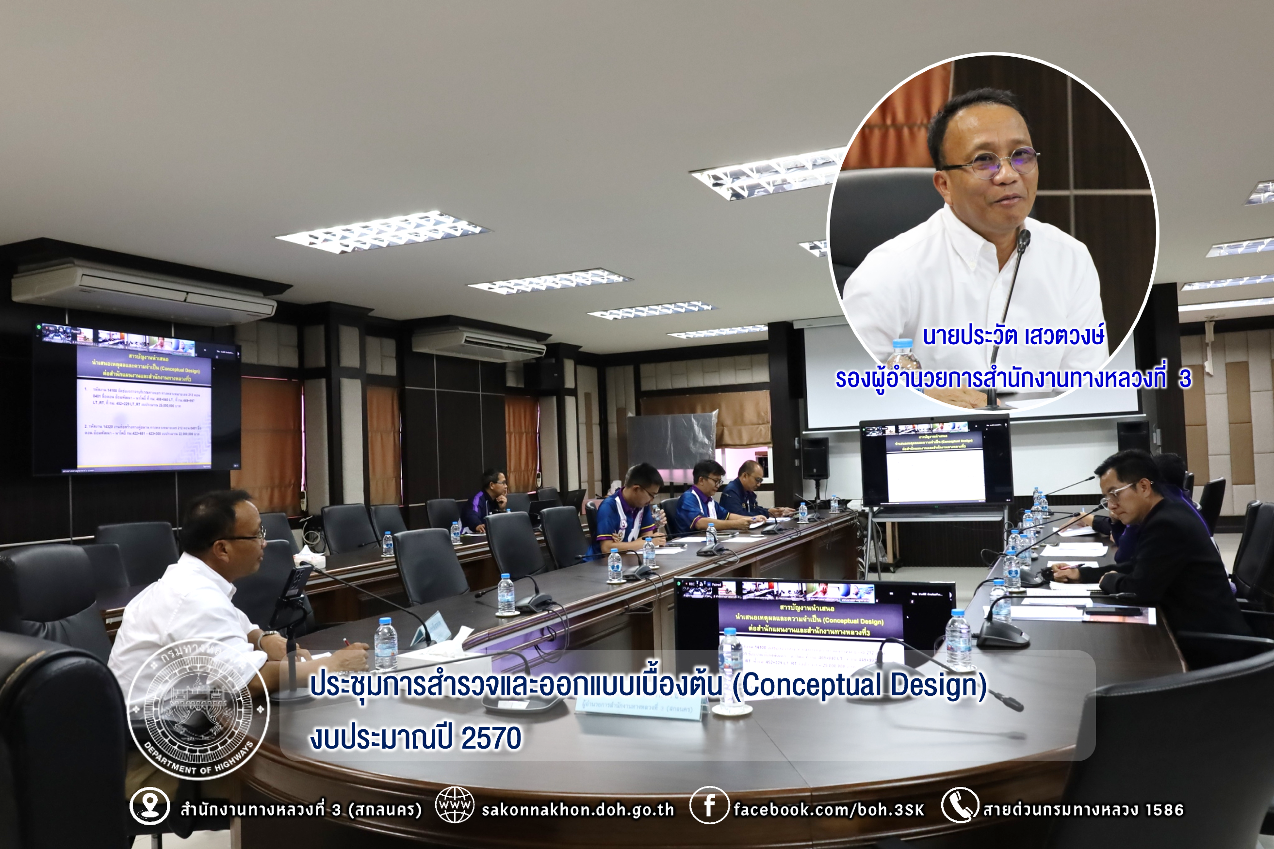 นายประวัติ เสวตวงษ์ รส.ทล.3.2 พร้อมด้วย นายธนัชพงศ์ เลิศปิติพิทักษ์ วบ.ทล.3 นายสมชาย สุทธิบริบาล วก.ทล.3 และวิศวกรโยธา/นายช่างโยธา ส่วนแผนงาน และส่วนสำรวจและออกแบบ ได้เข้าร่วมประชุมการสำรวจและออกแบบเบื้องต้น (Conceptual Design) งานปี 2570 เพื่อร่วมกันพิจารณาแนวทางและเตรียมความพร้อมในการดำเนินงาน ณ ห้องประชุมทวีพัฒน์ ตินะมาส ชั้น 3 โดยมี แขวงทางหลวงในสังกัดฯ เข้าร่วมประชุม ณ ที่ตั้งหน่วยงานผ่านสื่ออิเล็กทรอนิกส์แอปพลิเคชั่น Zoom Cloud Meeting