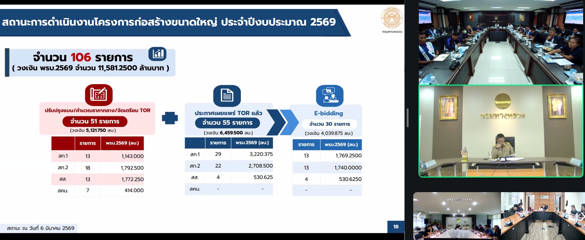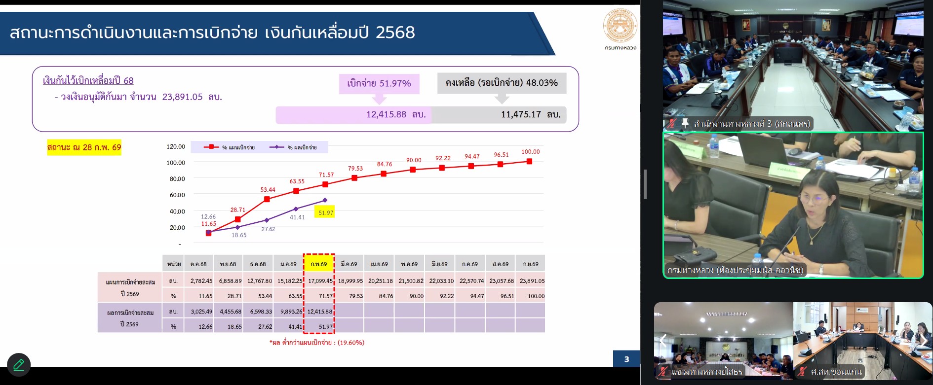 นายชัยธวัช พรหมวิชัย ผู้อำนวยการสำนักงานทางหลวงที่ 3 พร้อมด้วย คณะผู้บริหาร/เจ้าหน้าที่ในสังกัดฯ ได้เข้าร่วมประชุมผู้บริหารกรมทางหลวง ประจำเดือน มีนาคม 2569 ครั้งที่ 3/2569 เพื่อรับทราบและติดตามการดำเนินงานในประเด็นสำคัญ ดังนี้: