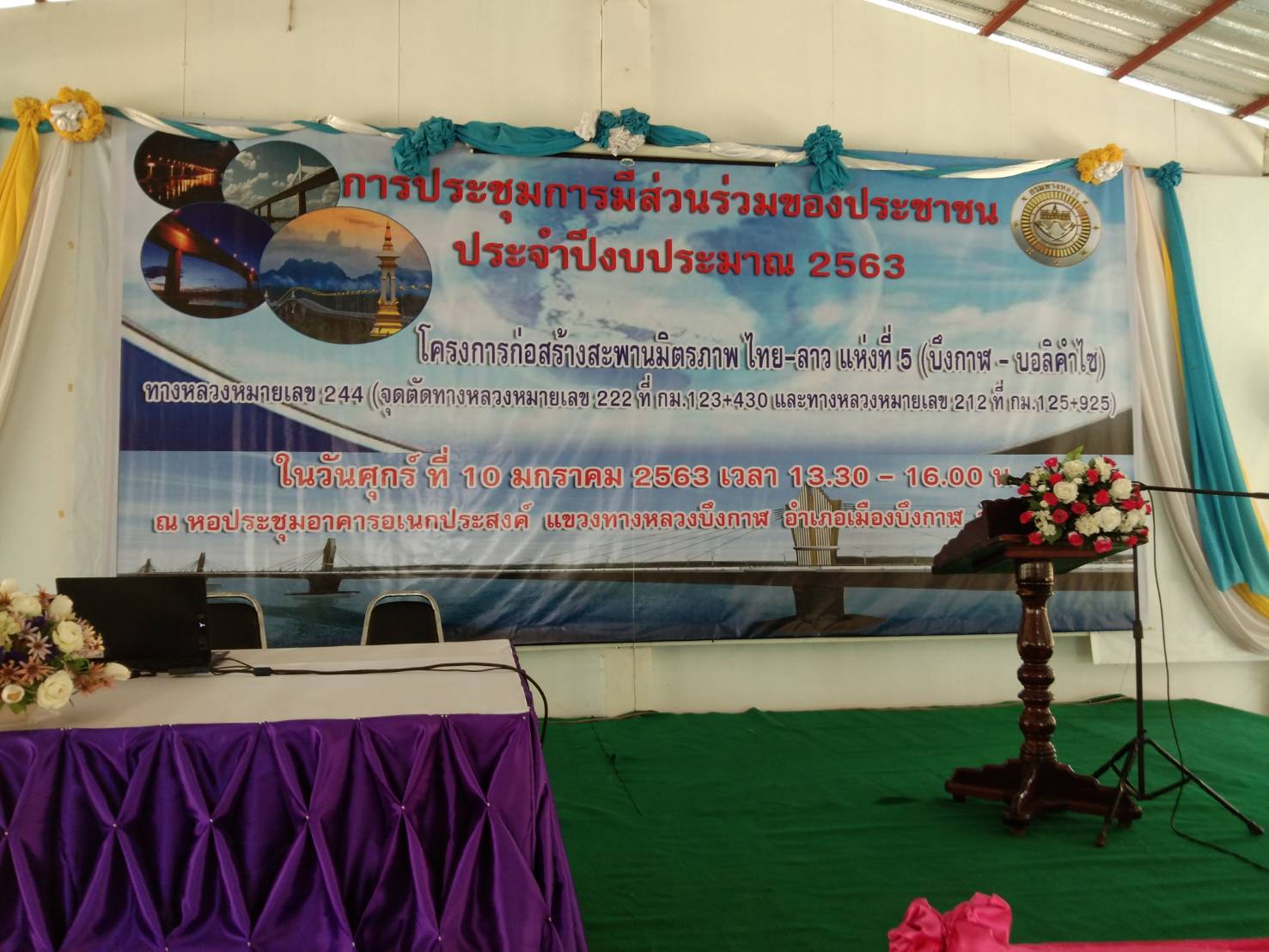 วันที่ 10 มกราคม 2563 เวลา13.30 น.นายหนูกาญ เจริญไชย นักวิชาการจัดหาที่ดินชำนาญการ ส่วนกฎหมายและกรรมสิทธิ์ที่ดิน สำนักงานทางหลวงที่ 3 (สกลนคร) พร้อมด้วย นายชัชดา พรมนันท์ หัวหน้าโครงการจัดกรรมสิทธิ์ที่ดินที่2 เป็นตัวแทนสำนักงานทางหลวงที่ 3 (สกลนคร) เข้าร่วมประชุมการมีส่วนร่วมของประชาชนประจำปี2563 ของโครงการก่อสร้างสะพานมิตรภาพไทย-ลาว แห่งที่ 5(บึงกาฬ-บอลิคำไซ) ณ ห้องประชุมอาคารอเนกประสงค์ แขวงทางหลวงบึงกาฬ