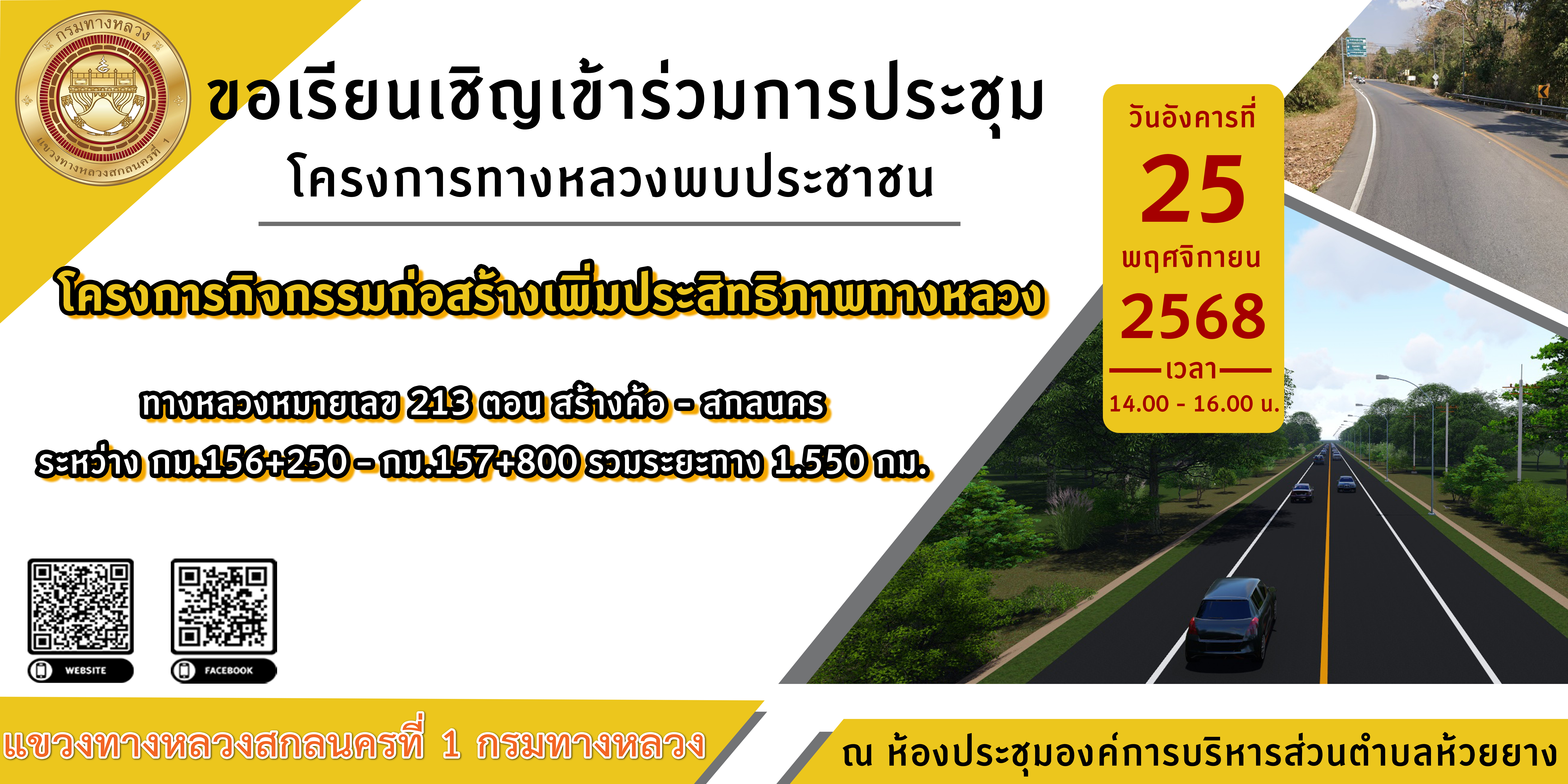 ขอเรียนเชิญเข้าร่วมการประชุมโครงการกิจกรรมก่อสร้างเพิ่มประสิทธิภาพทางหลวง ทางหลวงหมายเลข 213 ตอน สร้างค้อ - สกลนคร