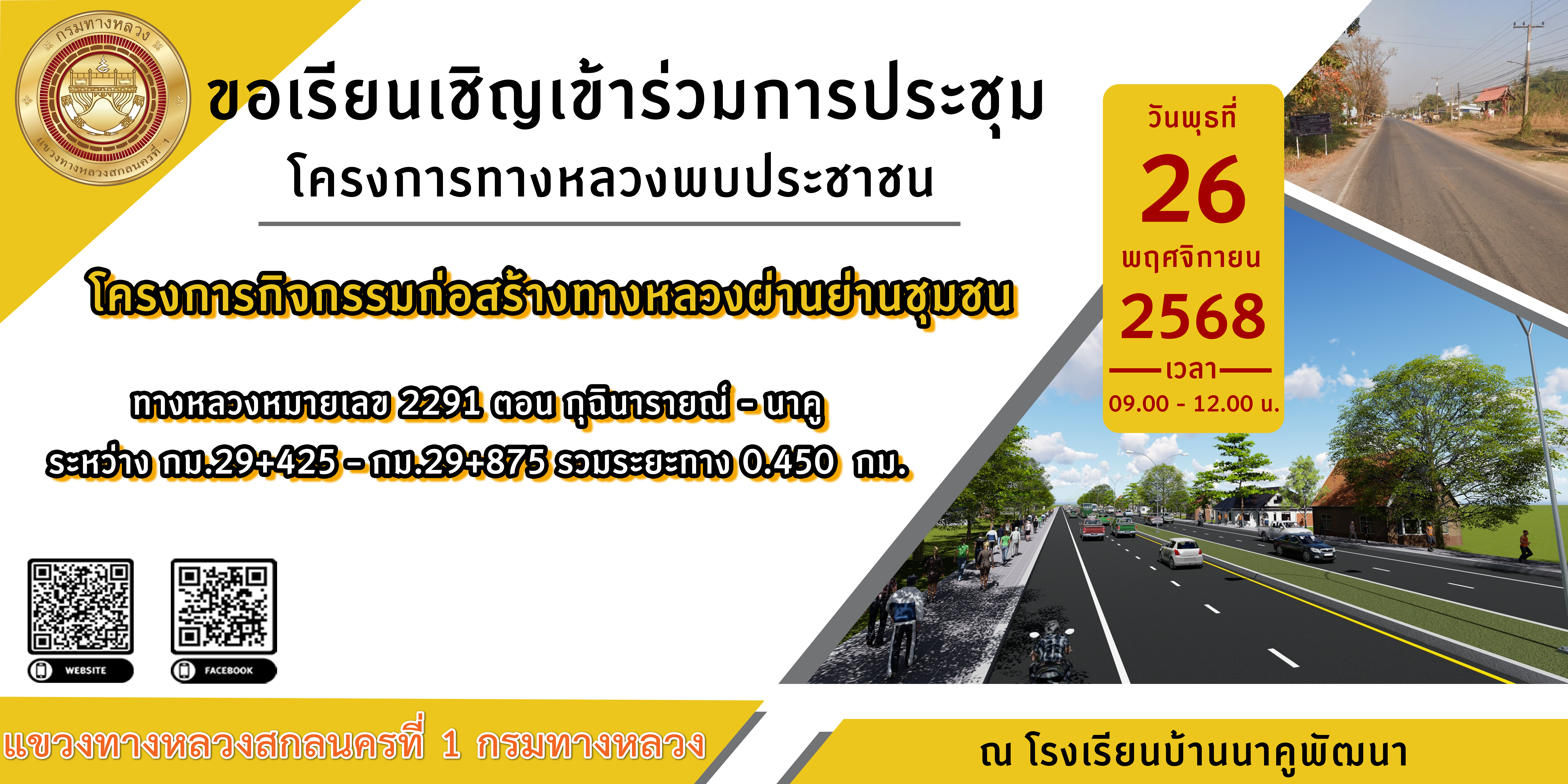 ขอเรียนเชิญเข้าร่วมการประชุมโครงการกิจกรรมก่อสร้างทางหลวงผ่านย่านชุมชน ทางหลวงหมายเลข 2291 ตอน กุฉินารายณ์ - นาคู