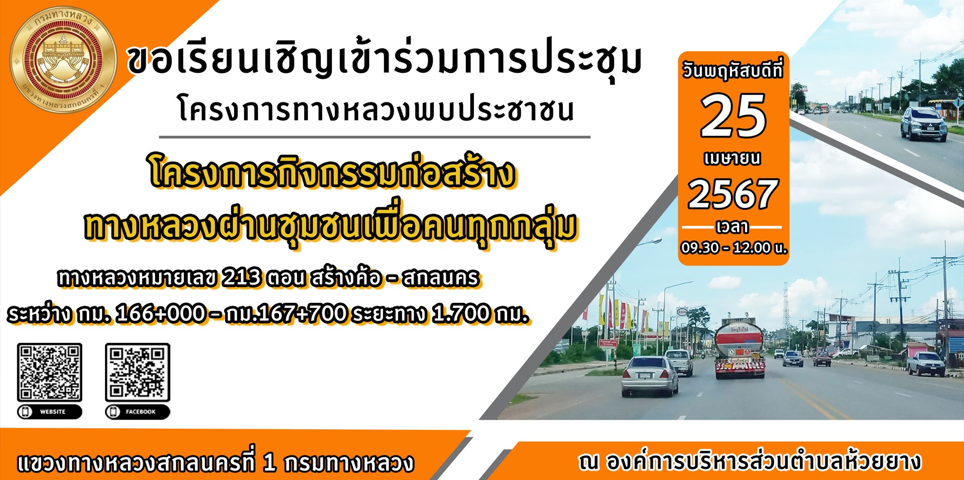 ขอเรียนเชิญประชาชนผู้ใช้ถนนและประชาชนผู้อยู่อาศัยบริเวณ ทางหลวงหมายเลข 213 ตอน สร้างค้อ - สกลนคร เข้าร่วมการประชุม โครงการทางหลวงพบประชน