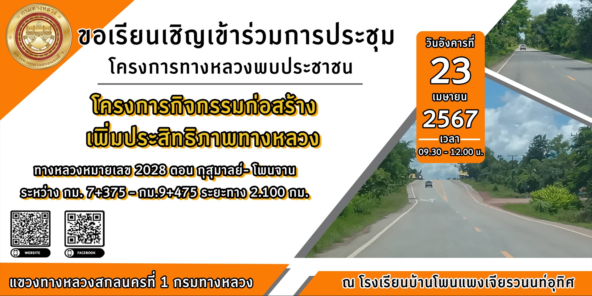 ขอเรียนเชิญประชาชนผู้ใช้ถนนและประชาชนผู้อยู่อาศัยบริเวณ ทางหลวงหมายเลข 2028 ตอน กุสุมาลย์ - โพนจาน เข้าร่วมการประชุม โครงการทางหลวงพบประชาชน โครงการสำรวจและออกแบบพร้อมเตรียมการก่อสร้างที่ได้รับงบประมาณในปี 2567