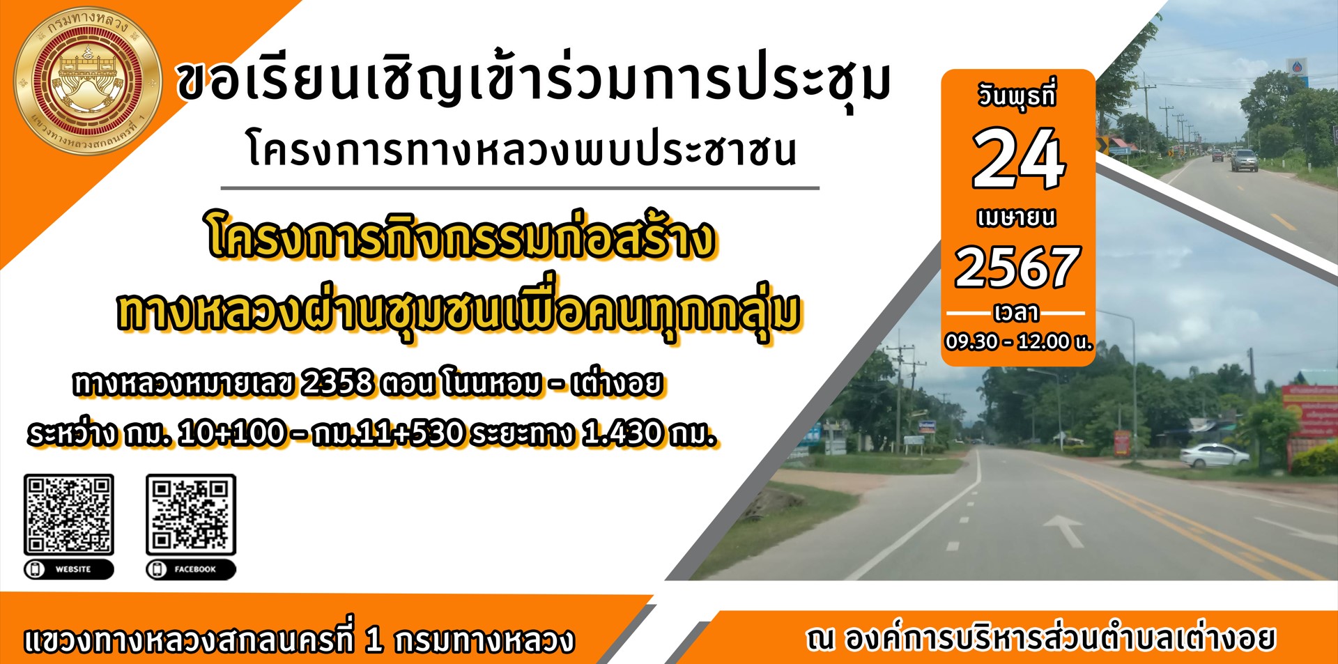 ขอเรียนเชิญประชาชนผู้ใช้ถนนและประชาชนผู้อยู่อาศัยบริเวณ ทางหลวงหมายเลข 2358 ตอน โนนหอม - เต่างอย เข้าร่วมการประชุม โครงการทางหลวงพบประชาชน โครงการสำรวจและออกแบบพร้อมเตรียมการก่อสร้างที่ได้รับงบประมาณในปี 2567