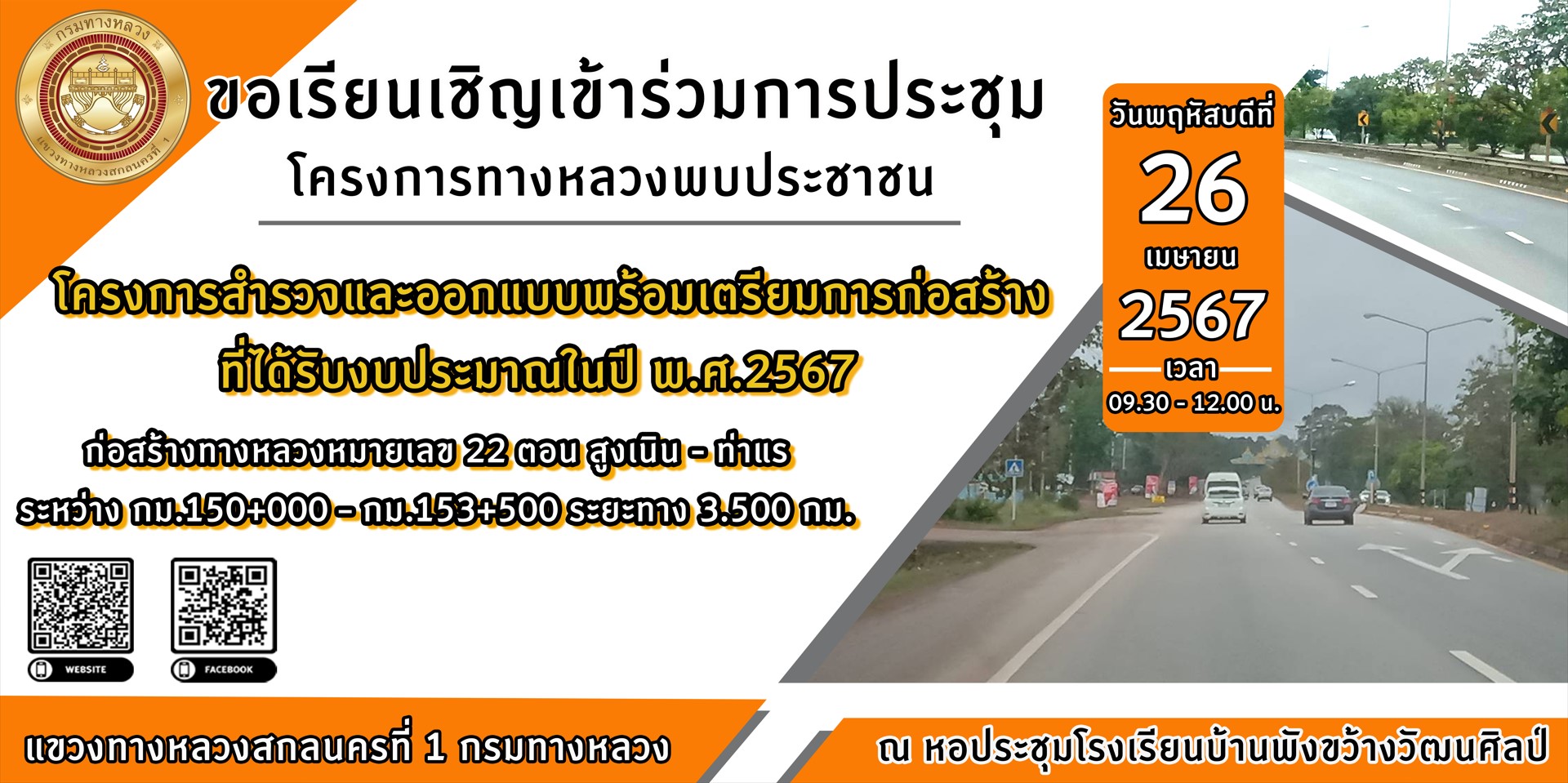 ขอเรียนเชิญประชาชนผู้ใช้ถนนและประชาชนผู้อยู่อาศัยบริเวณ ทางหลวงหมายเลข 22 ตอน สูงเนิน - ท่าแร่ เข้าร่วมการประชุม โครงการทางหลวงพบประชาชน โครงการสำรวจและออกแบบพร้อมเตรียมการก่อสร้างที่ได้รับงบประมาณในปี 2567