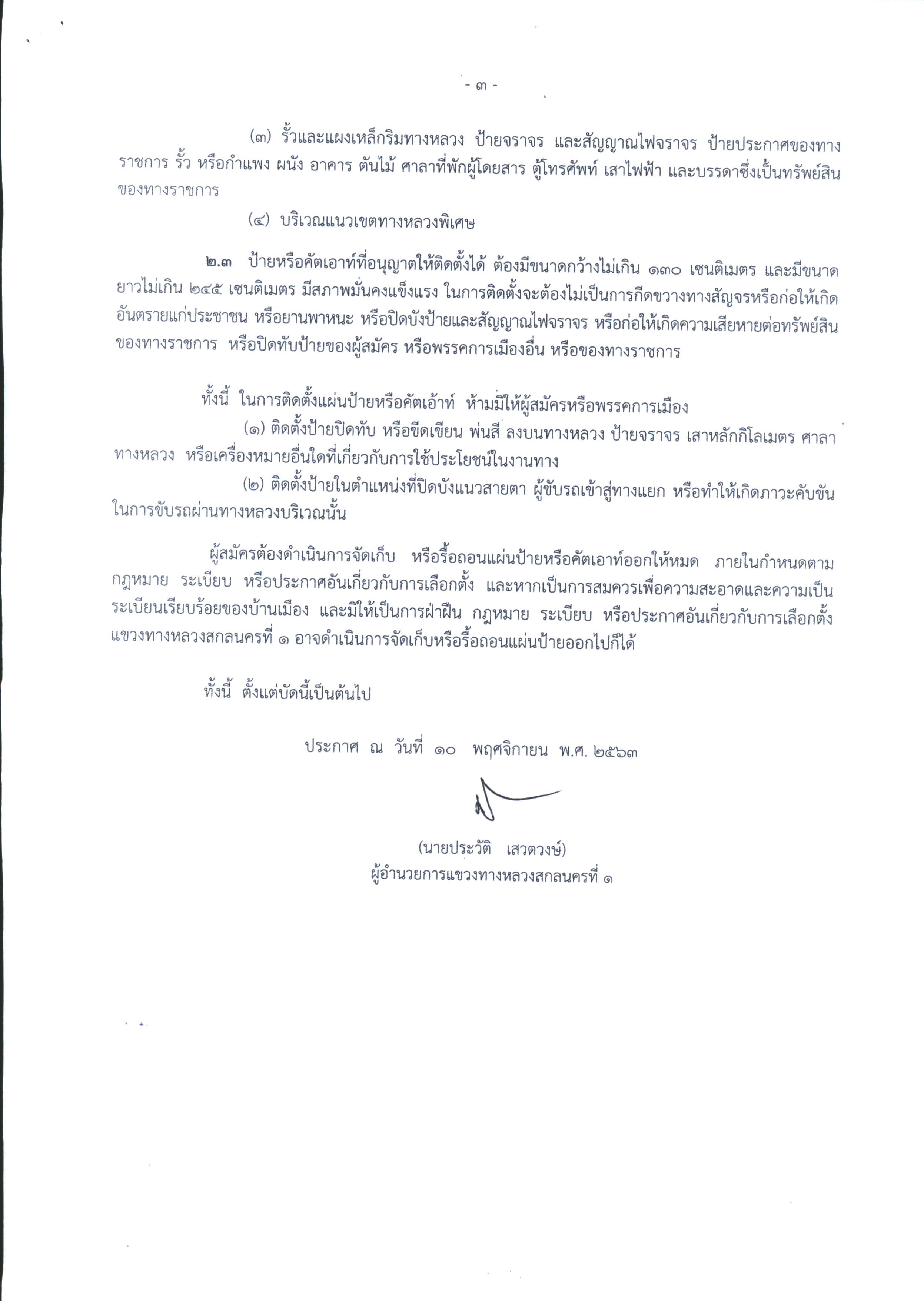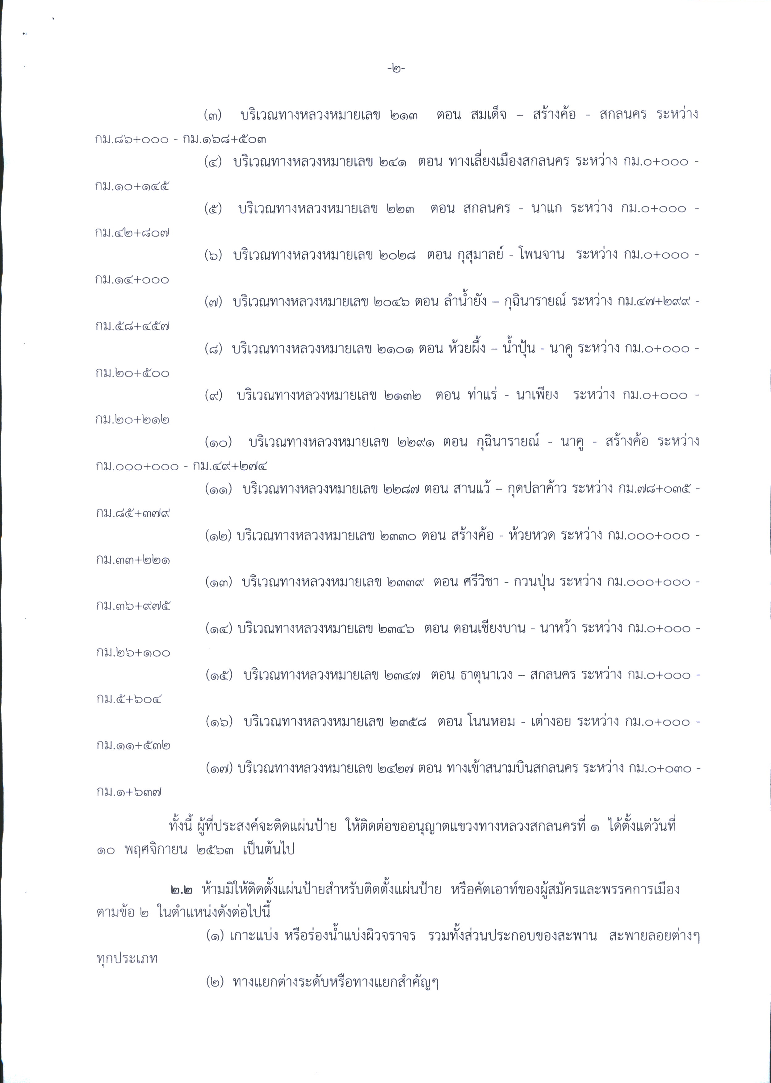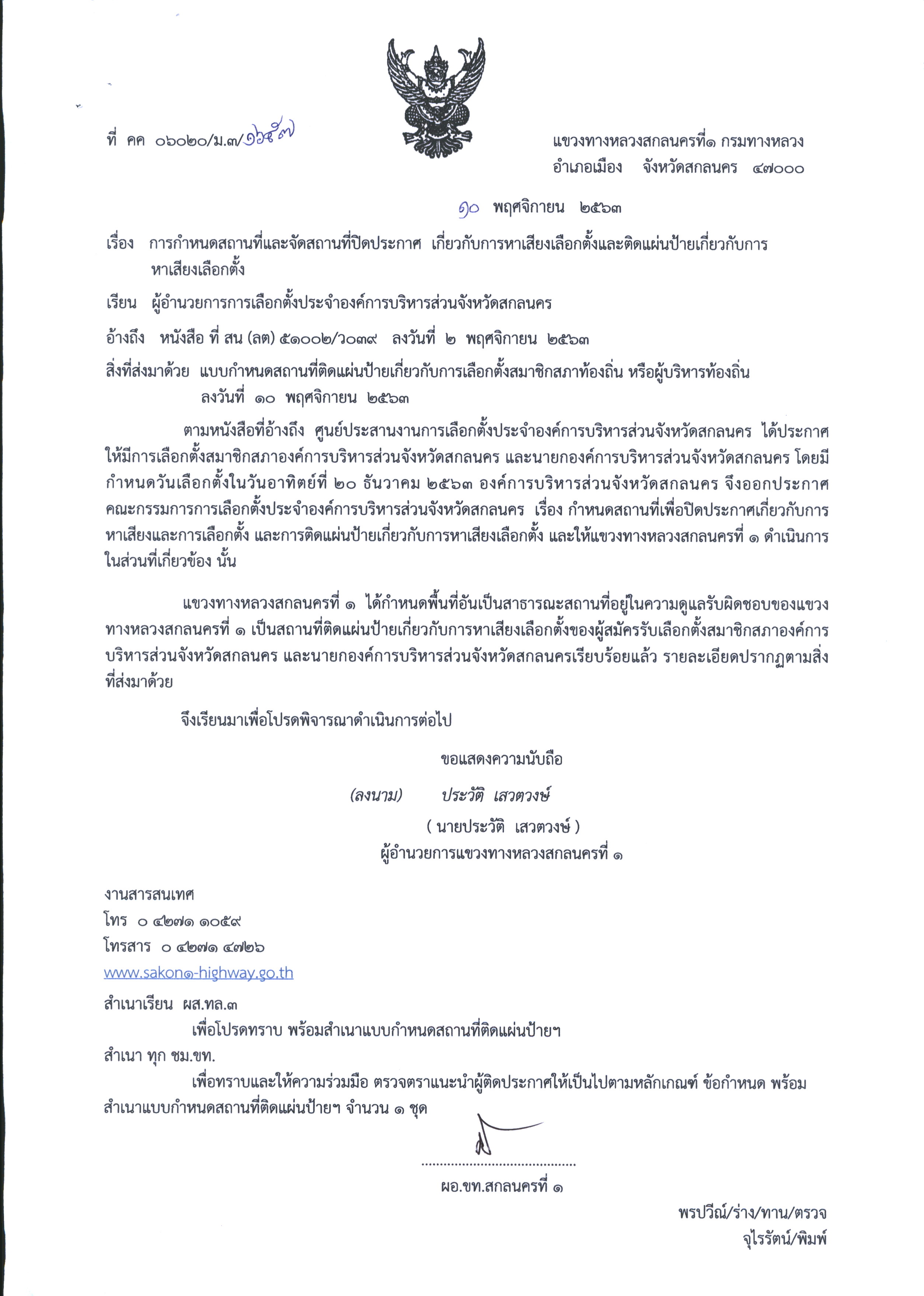 หาเสียงและการเลือกตั้ง และการติดแผ่นป้ายเกี่ยวกับการหาเสียงเลือกตั้ง และให้แขวงทางหลวงสกลนครที่ ๑ ดำเนินการ