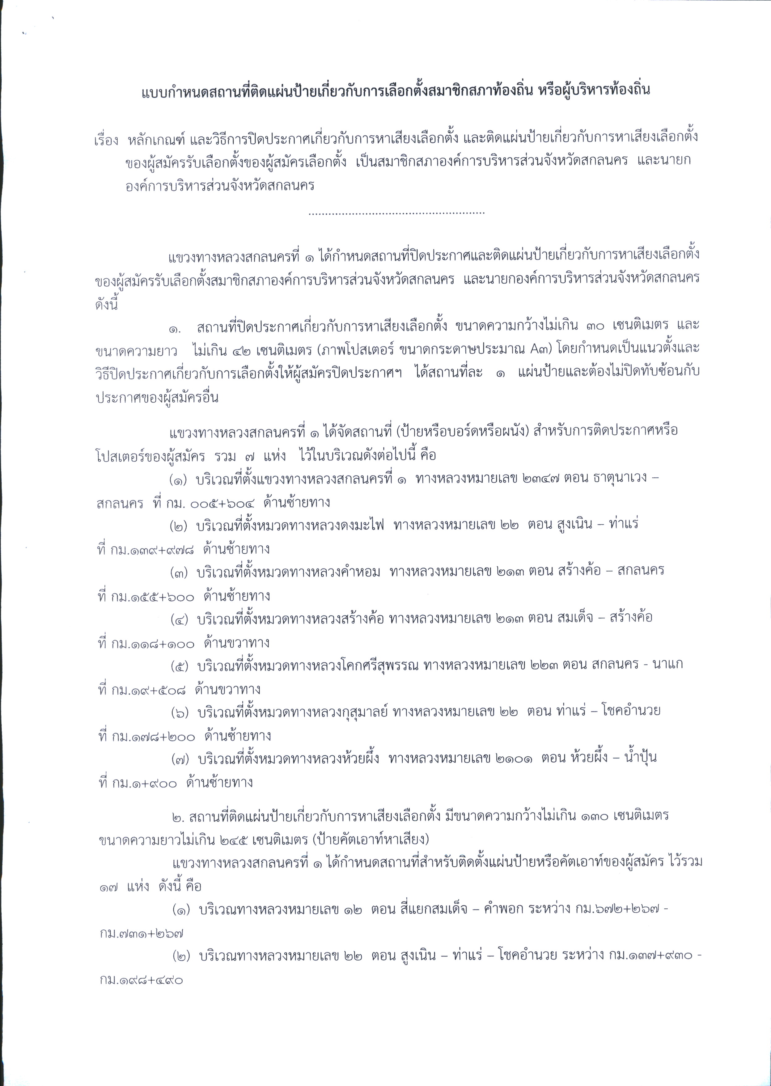คณะกรรมการการเลือกตั้งประจำองค์การบริหารส่วนจังหวัดสกลนคร เรื่อง กำหนดสถานที่เพื่อปิดประกาศเกี่ยวกับการ