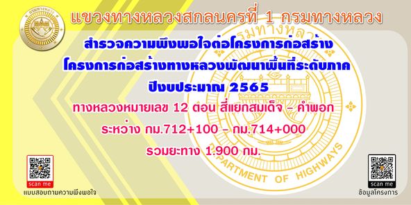 เเขวงทางหลวงสกลนครที่ 1 ขอเรียนเชิญประชนชนทุกท่าน มีส่วนร่วมในการเเสดงความคิดเห็นในโครงการงานก่อสร้างทางหลวงพัฒนาพื้นที่ระดับภาค ทางหลวงหมายเลข 12 ตอน สี่แยกสมเด็จ - คำพอก ระหว่าง กม.712+100 - กม.714+000 รวมยะทาง 1.900 กม.