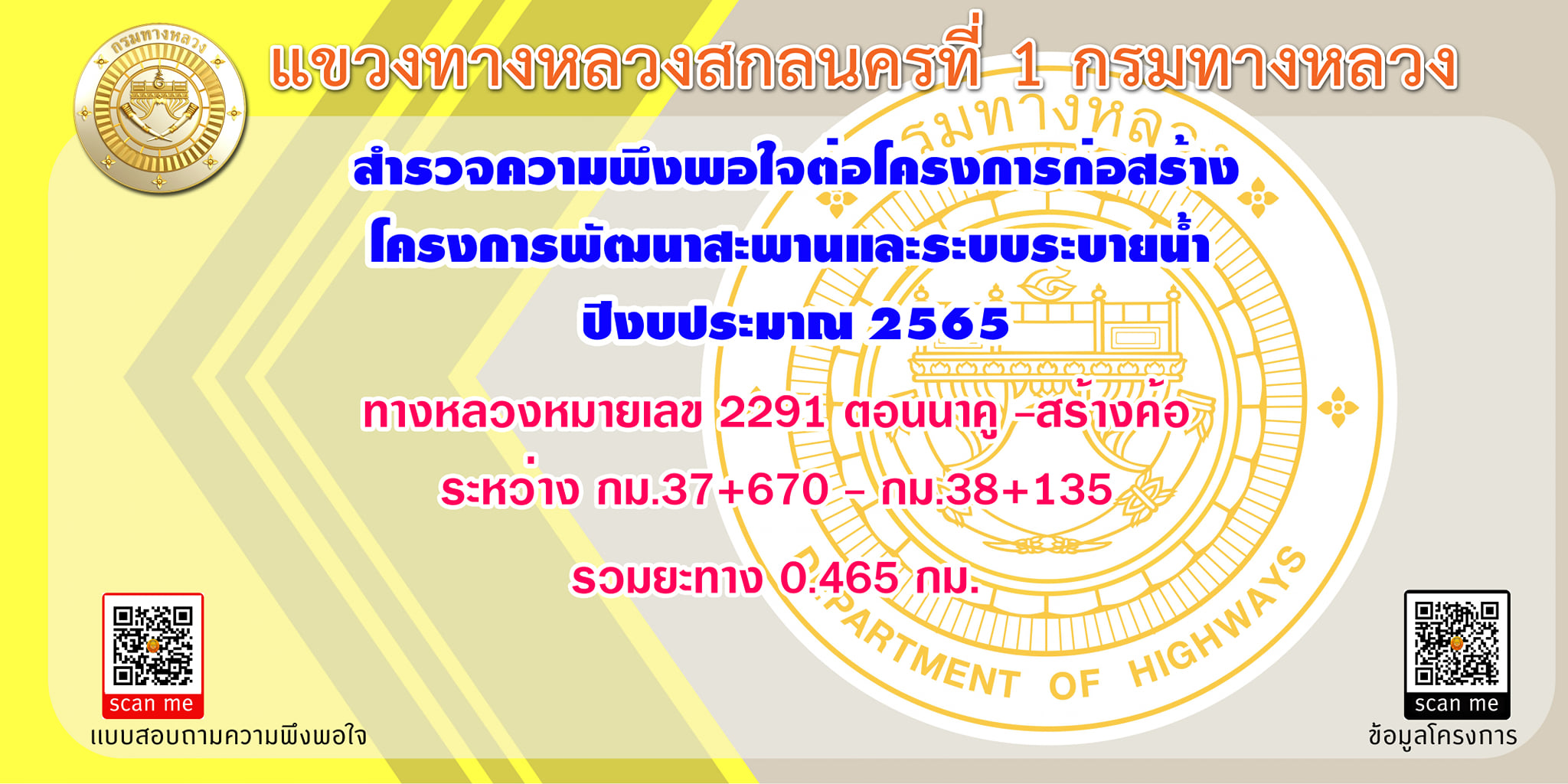 เเขวงทางหลวงสกลนครที่ 1 ขอเรียนเชิญประชนชนทุกท่าน มีส่วนร่วมในการเเสดงความคิดเห็นในโครงการโครงการพัฒนาสะพานและระบบระบายน้ำ ทางหลวงหมายเลข 2291 ตอนนาคู -สร้างค้อ ระหว่าง กม.37+670 - กม.38+135 รวมยะทาง 0.465 กม.