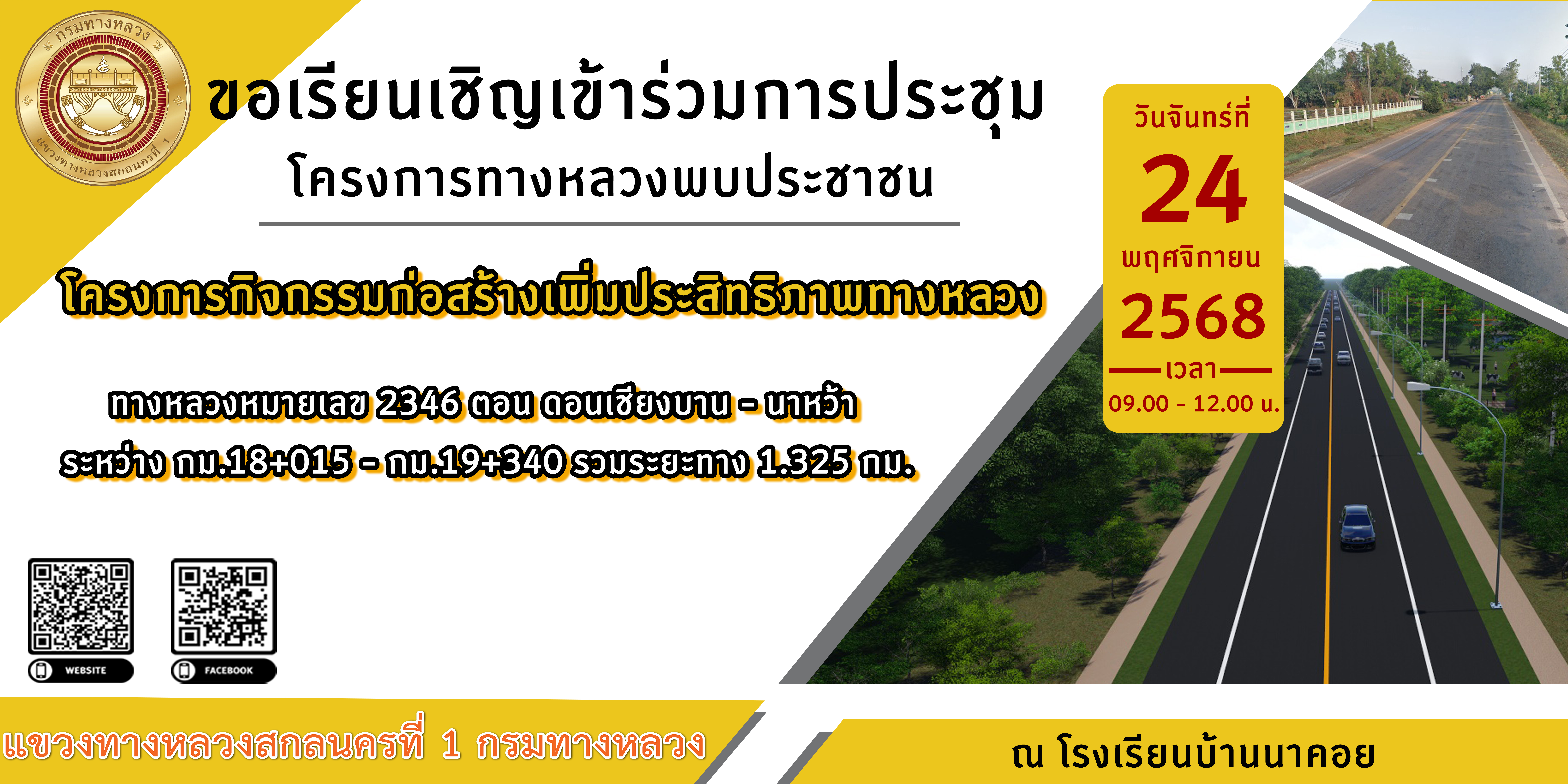 ขอเรียนเชิญเข้าร่วมการประชุมโครงการทางหลวงพบประชาชน โครงการกิจกรรมก่อสร้างเพิ่มประสิทธิภาพทางหลวง ทางหลวงหมายเลข 2346 ตอน ดอนเชียงบาน - นาหว้า ระหว่าง กม.18+015 - กม.19+340 รวมระยะทาง 1.325 กม. ณ โรงเรียนบ้านนาคอย วันจันทร์ที่ 24 พฤศจิกายน 2568 เวลา 09.00น.
