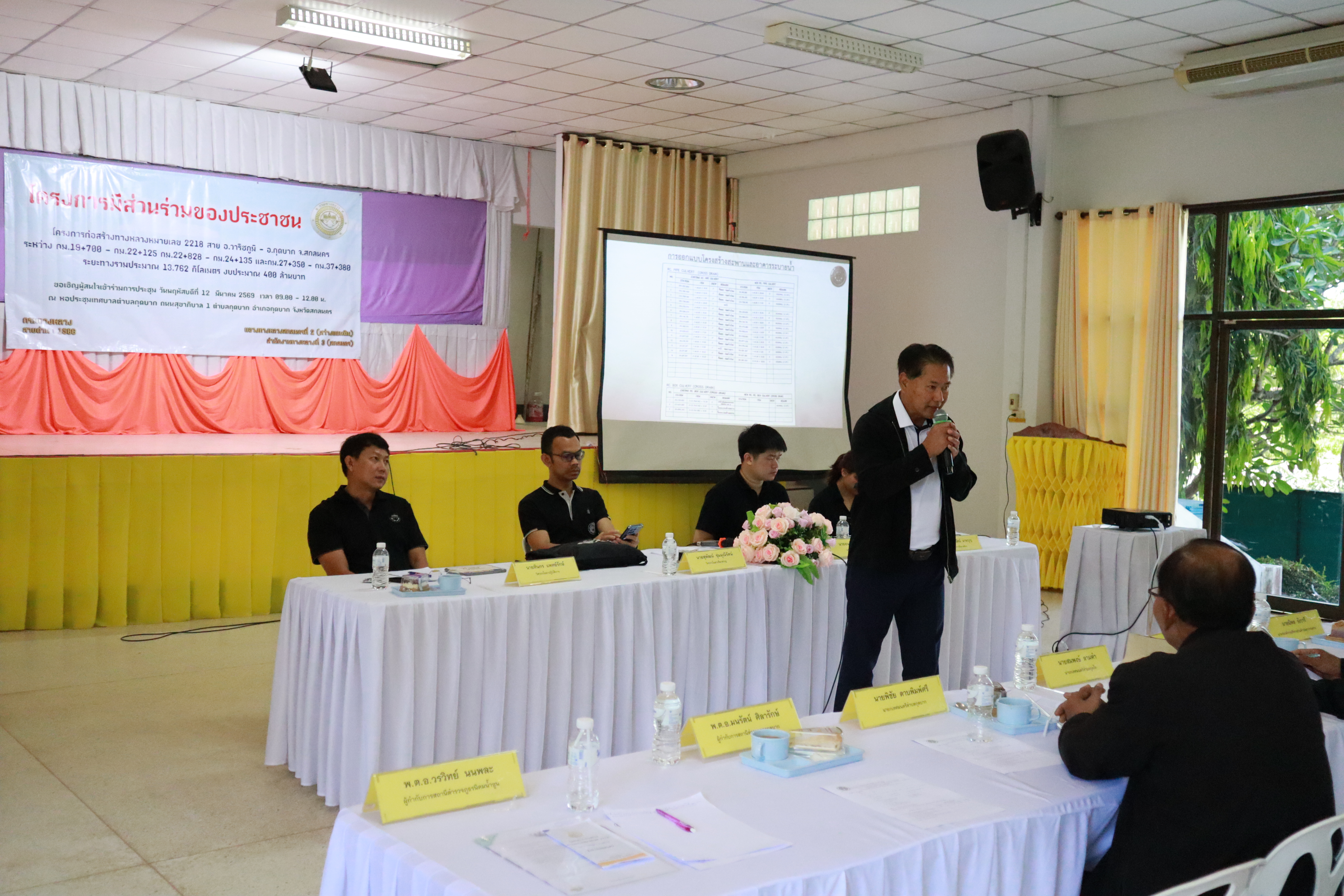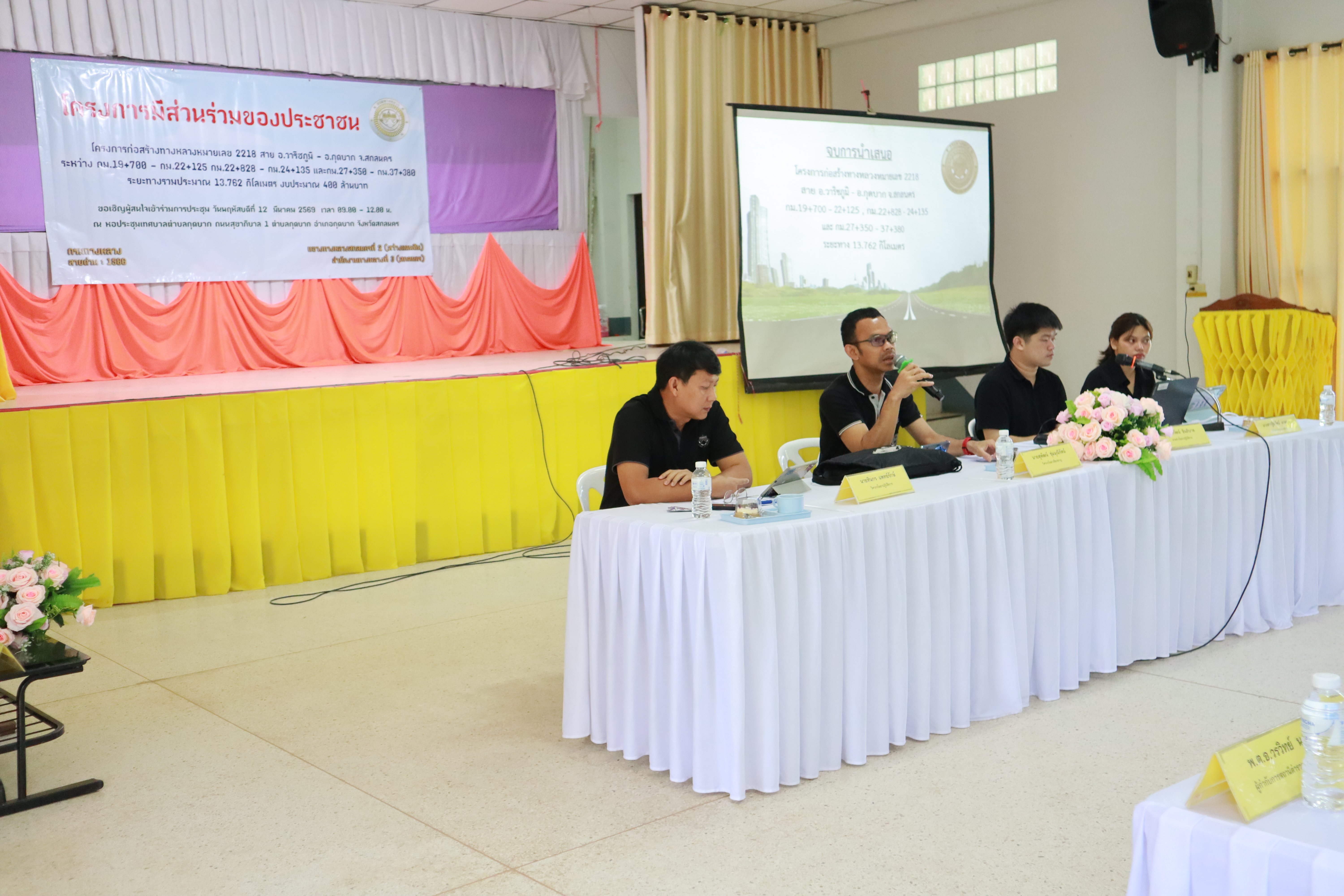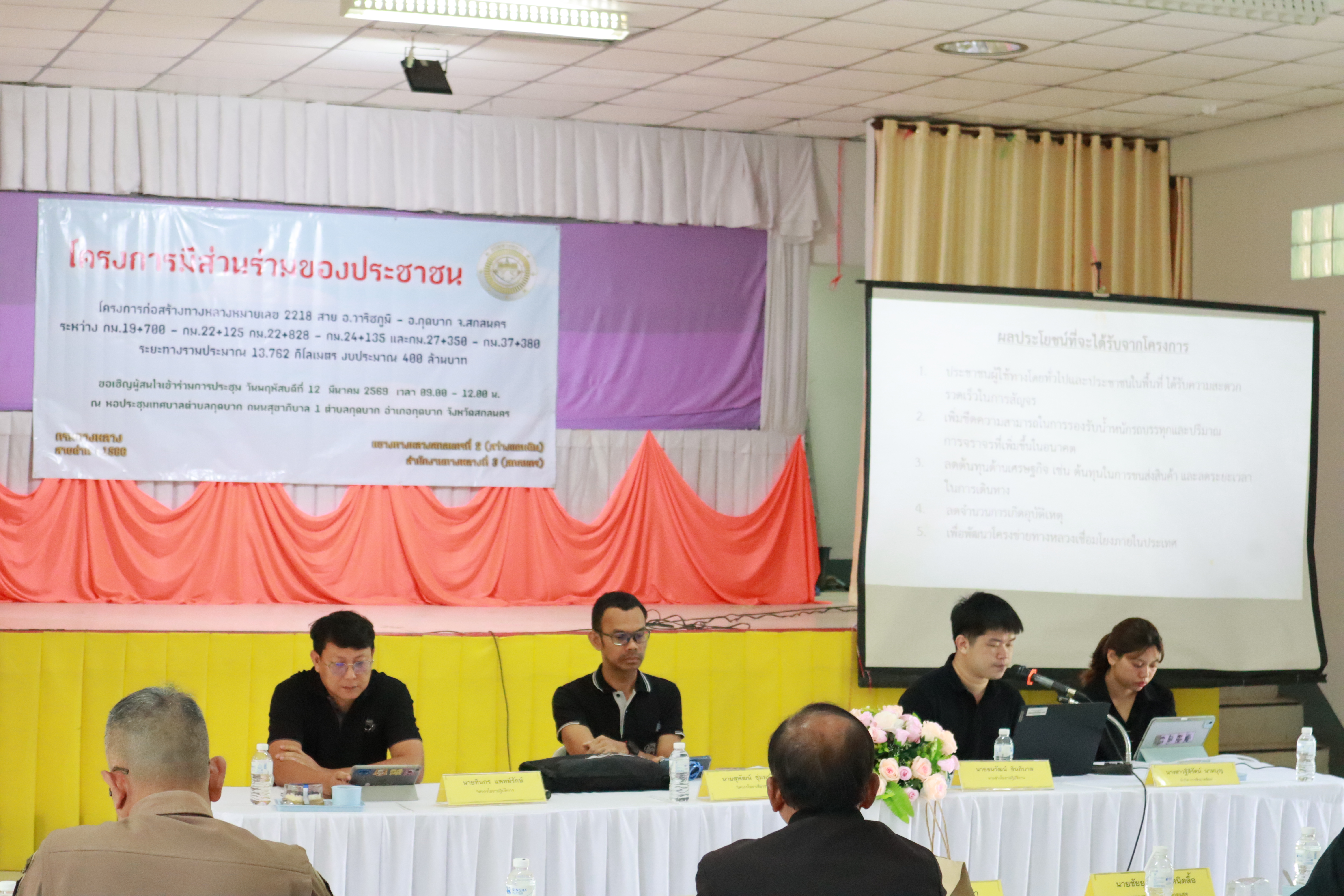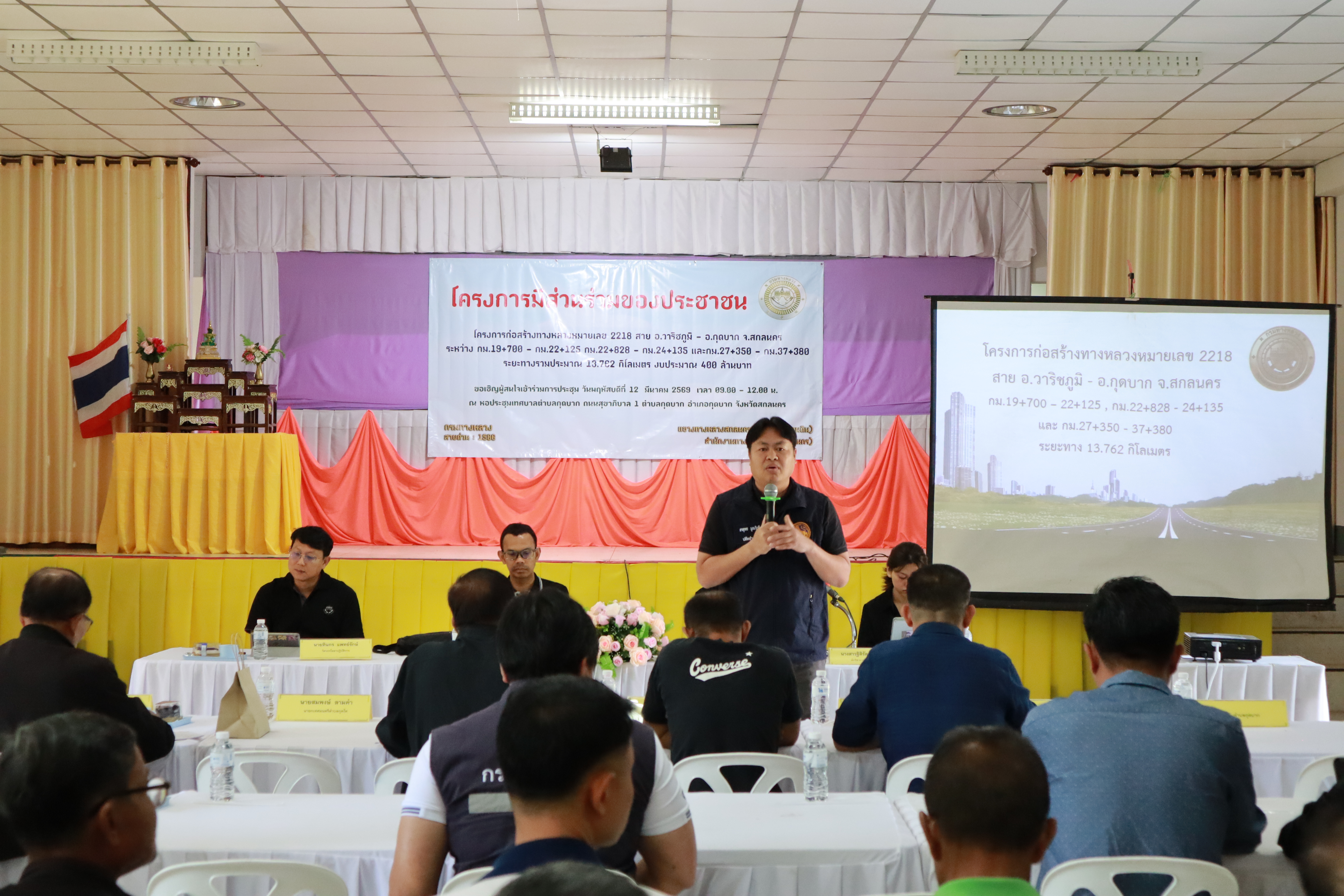 วันพฤหัสบดีที่ 12 มีนาคม 2569 นายภูวสิษฏ์ เชื่อมชัยตระกูล ผู้อำนวยการแขวงทางหลวงสกลนครที่ 2 (สว่างแดนดิน) นางไพรวรรณ เทือกกอง รองผู้อำนวยการฝ่ายบริหาร ตัวเเทนเจ้าหน้าที่จาก สำนักสำรวจและออกแบบ และสำนักก่อสร้างทางที่ 2 กรมทางหลวง กระทรวงคมนาคม ข้าราชการและเจ้าหน้าที่ที่เกี่ยวข้อง ได้ดำเนินการจัดโครงการมีส่วนร่วมของประชาชนโครงการก่อสร้างทางหลวงหมายเลข 2218 สาย อ.วาริชภูมิ - อ.กุดบาก จ.สกลนคร ระหว่าง กม.19+700 - กม.22+125, กม.22+828 - กม.24+135 และ กม.27+350 - กม.37+380 ระยะทาง 13.762 กม งบประมาณ 400 ล้านบาท ณ หอประชุมเทศบาลตำบลกุดบาก ถนนสุขาภิบาล 1 ตำบลกุดบาก อำเภอกุดบาก จังหวัดสกลนคร